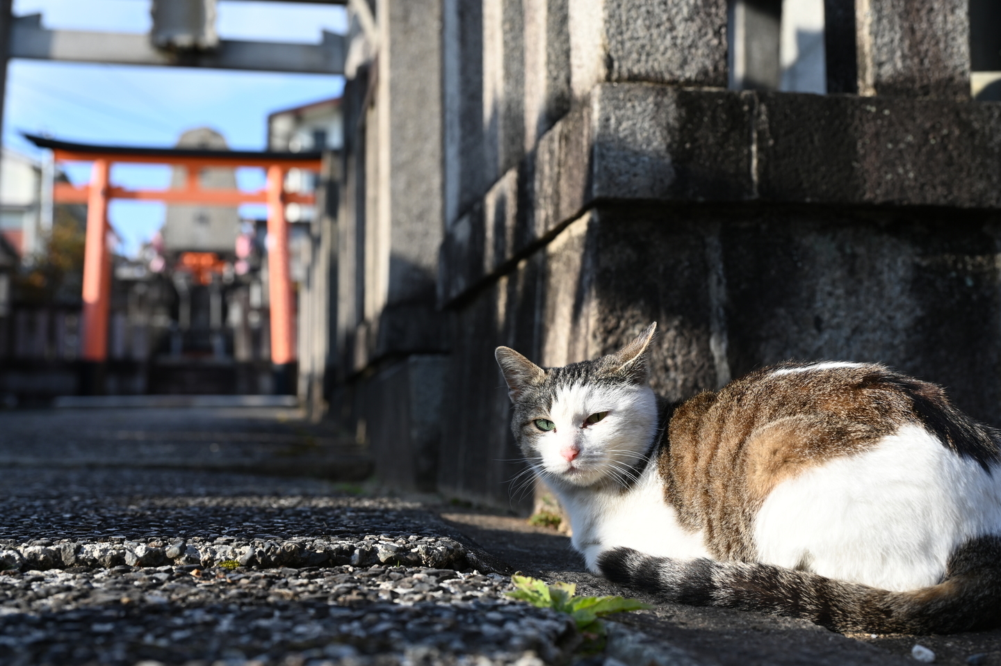神社の入口で、みゃーという声に呼び止められました。AFエリアモードを動物AFに切り替えて。エメラルドグリーンの猫の目の透明感が際立ちます。