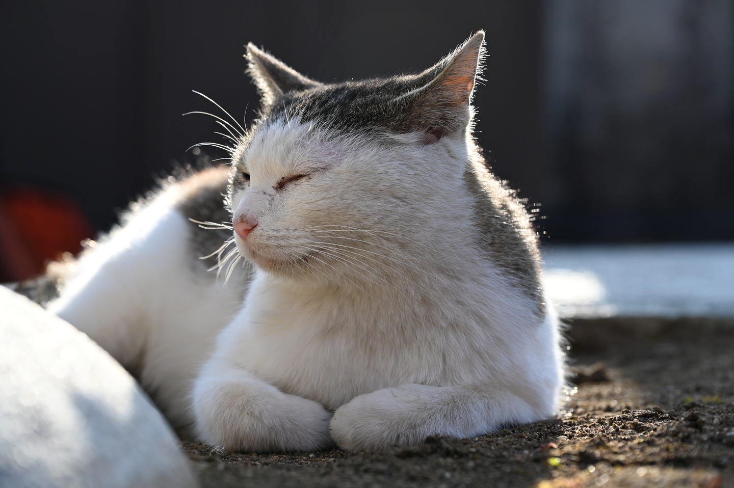 ネコ撮影にはやはり望遠域のレンズがマストアイテム。今回はそこそこ近寄ることを許してくれましたが、それでも気持ちよさそうなくつろぎタイムの邪魔をしないように、距離を取って望遠側で。ここでも70mmでは足りないところでした。