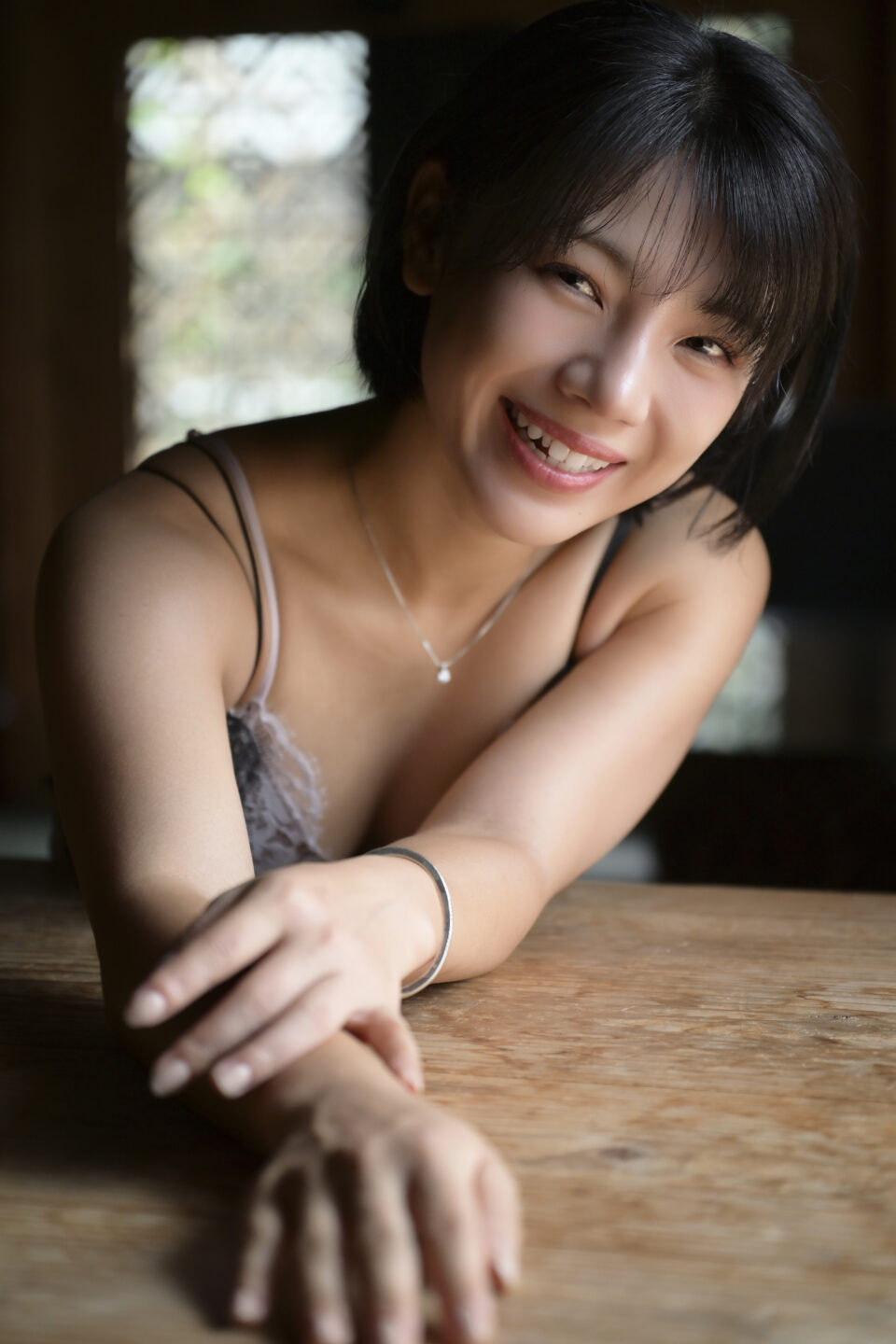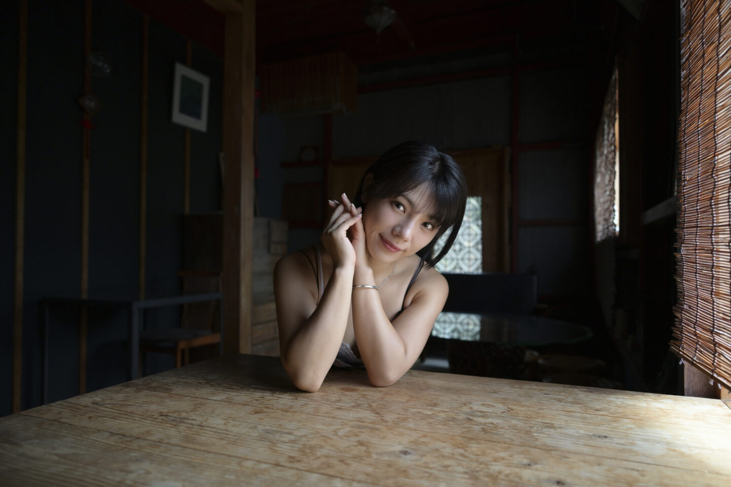 また、テーブルとモデルの肘で遠近感を強調したかったので、レンズをテーブルにくっつけるように撮影しています。広角端で撮影しているので、写真の印象よりも実際は、モデルの顔にかなり近付いて撮影しています。