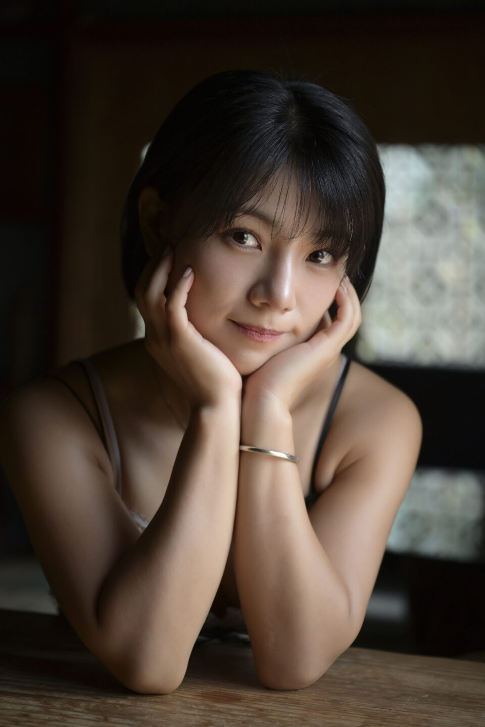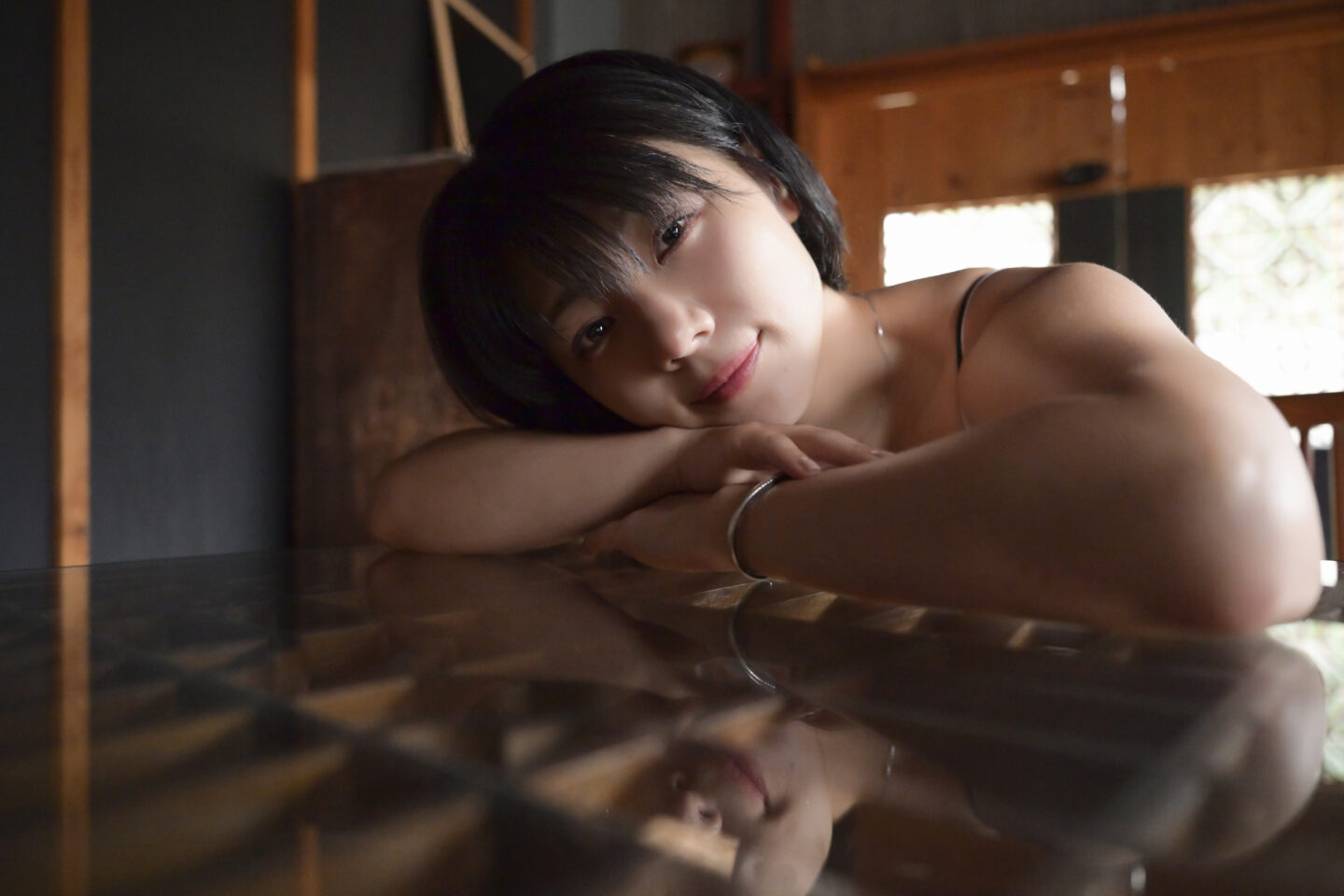 このシーンはガラスのテーブルの反射を写し込むために、肉眼でもかなり暗い状況で、構図右側にある窓からのわずかな自然光をメインの光として撮影しました。全体を明るい露出にしてしまうと反射が目立たなくなってしまうので、少し暗めの露出にするのがポイントのポートレートです。この薄暗いなか、前髪が目にかかっている状況にもかかわらず、精度の高いAFが綺麗に目にピントを合わせてくれました。