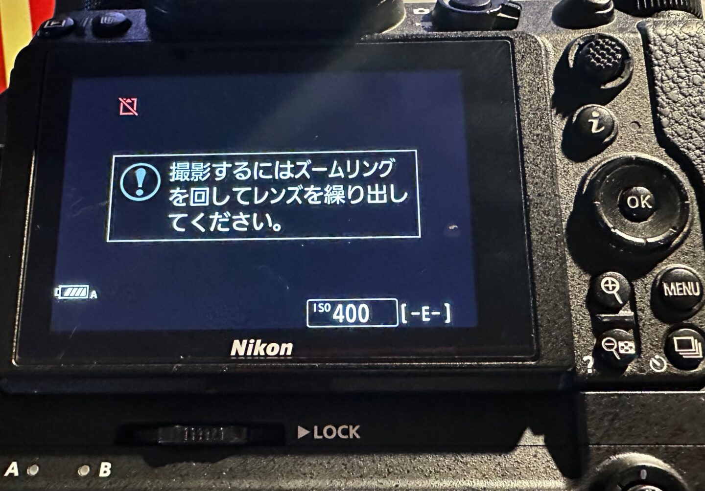 また、撮影をする際には「撮影するにはズームリングを回してレンズを繰り出してください。」という表示が出るので、24mmのところまで軽くズームをしてあげると撮影を開始することができます。