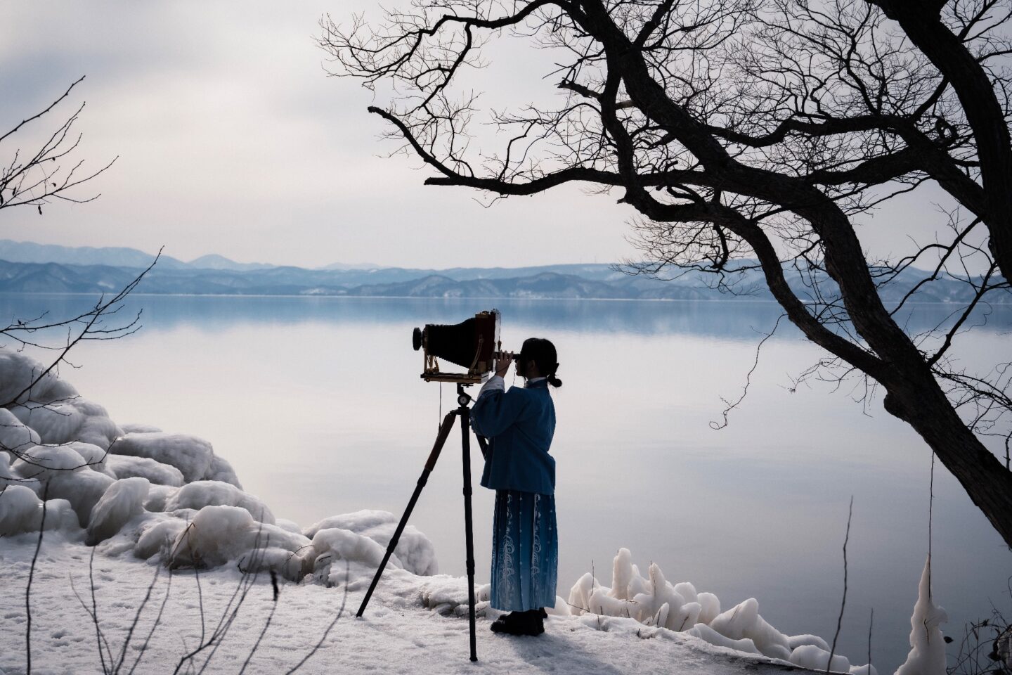 この場面は曇りの日に逆光で撮影をしました。大きめの三脚にカメラを取り付け、自分も脚立に乗ってハイアングルで撮影。意図としては、被写体と同じ目線から撮ってしまうと、後ろに写っている湖の対岸にある景色の境界線が人物とかぶってしまうため、人物が完全に湖の部分に入りきるようなアングルで撮影をしています。