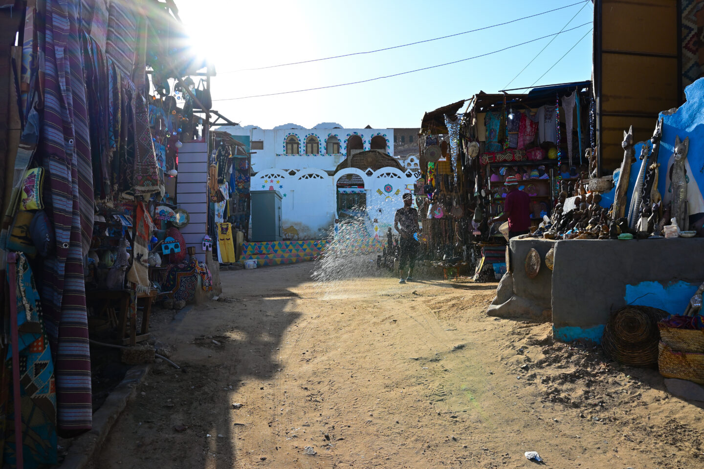 村のメインストリートは、お土産屋さんが軒を連ねています。これは日が落ちてきた夕方の時間ですが、お店の方が水をまいていました。村の道は砂場が多く、ここをラクダや車が通ると砂埃が舞うので、涼しくするためと砂埃防止の役目があるそうです。