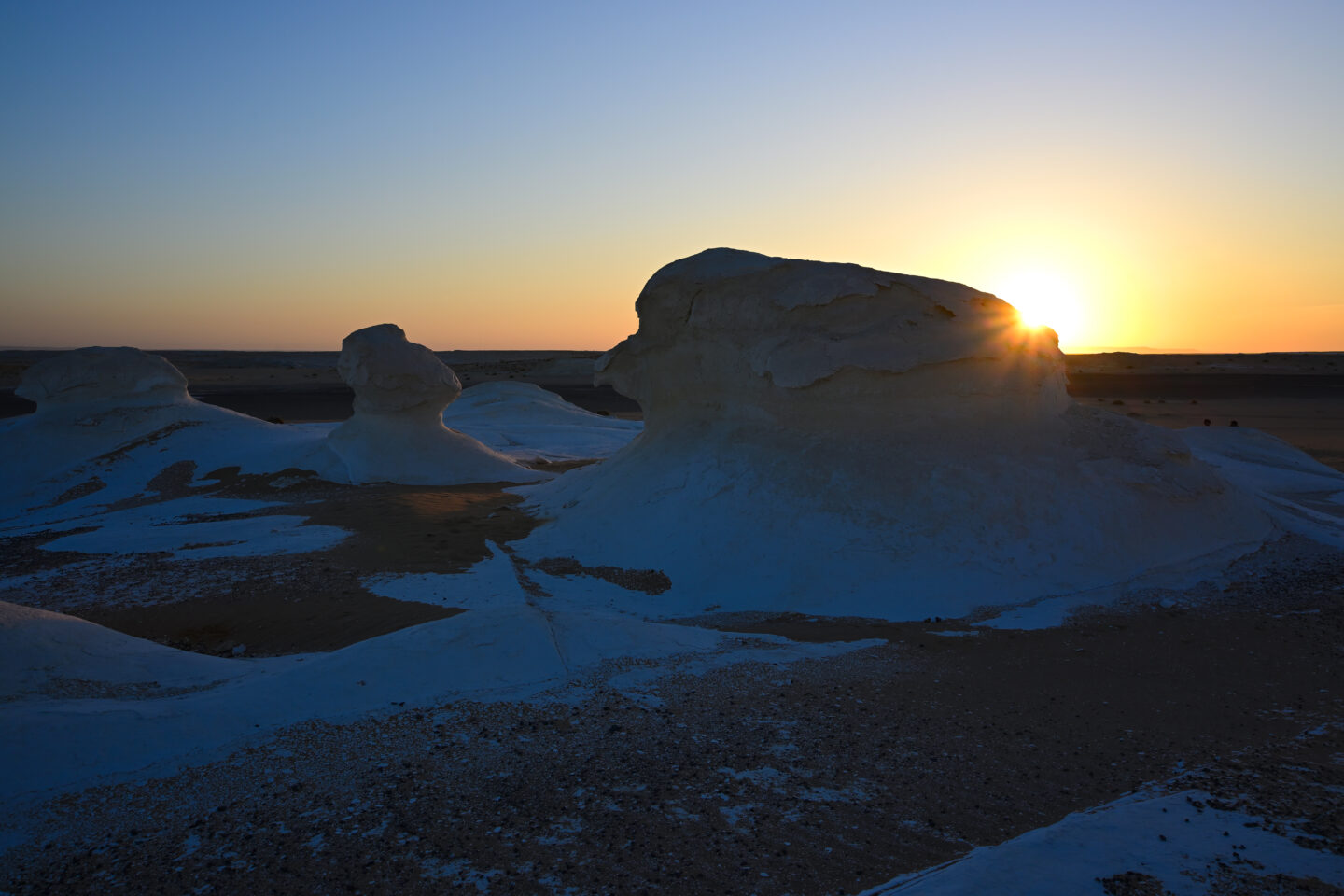 白い部分は岩で、茶色い部分は砂なのですが、このように見ると、まるで雪の中にいるようですね。日本よりも暑い夏のエジプトの砂漠ですが、朝だけは日本よりも涼しく、半袖では肌寒いほどでした。