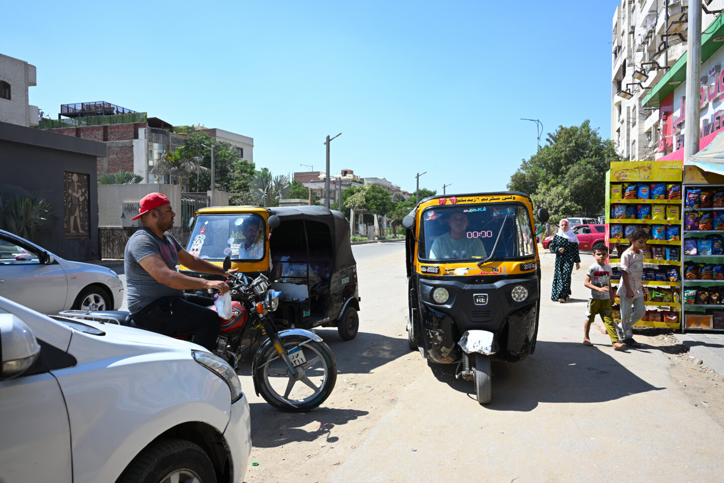 26mmの焦点距離と薄型形状のレンズは、街歩きのスナップでとても重宝しました。エジプトは車社会なので車やバイクはもちろん、観光地のギザ周辺ではトゥクトゥクもよく見かけました。彼らが乗り付けて買い物をしているのは、水やコーラなどのジュース、スナック類を売っている、駄菓子屋と呼ばれているコンビニのような小さなお店です。