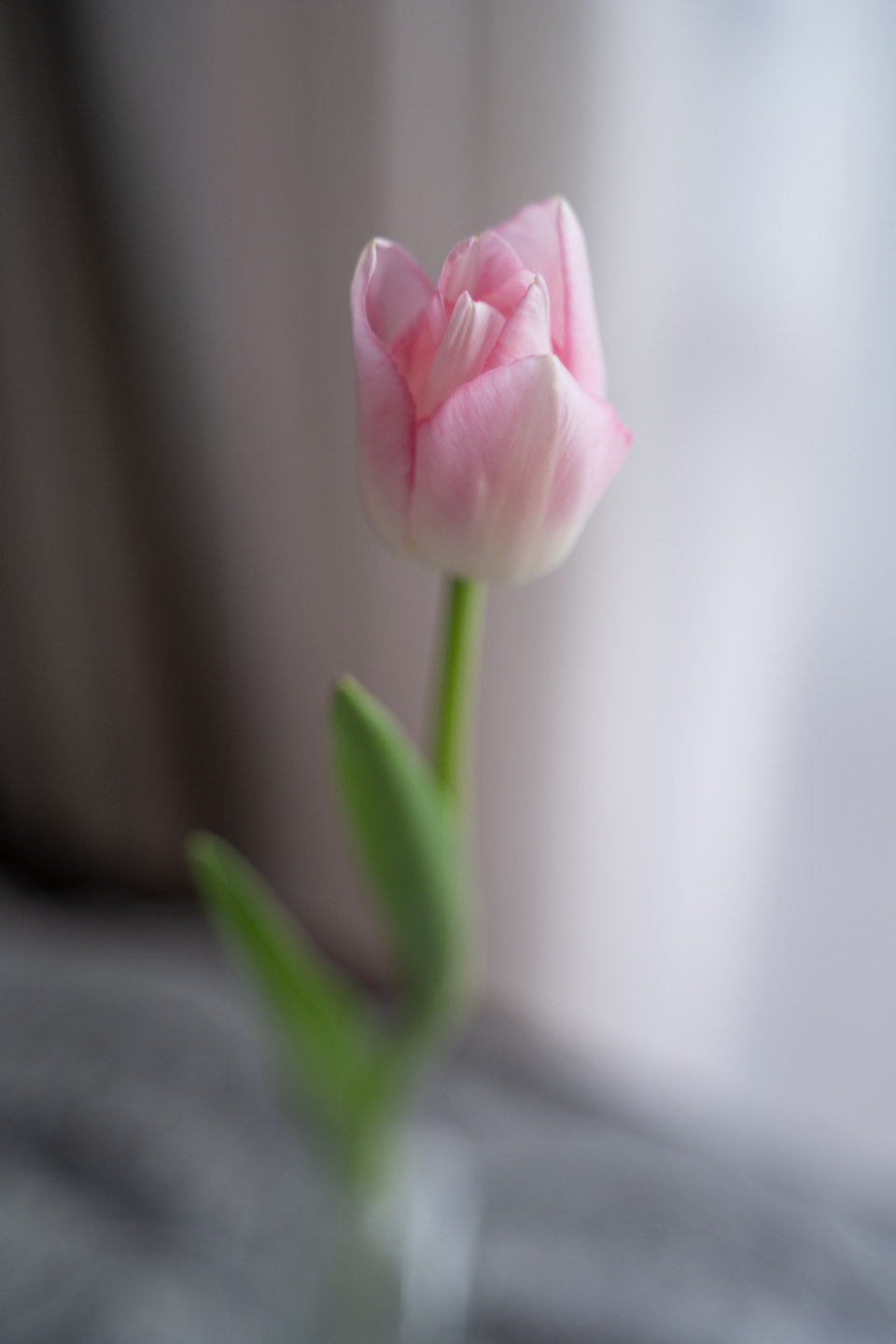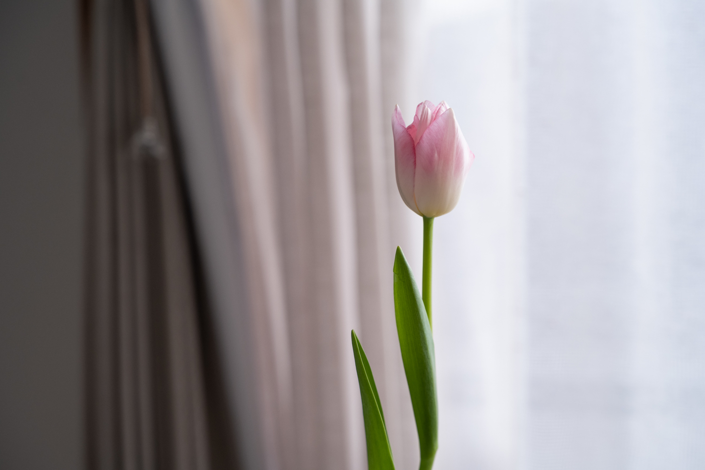 このズームレンズでついつい室内の物撮りを試したくなって、久しぶりに花屋さんに行ってきました。店先で花を眺めていて、白い部分がどんな写りをするのか、背景がどんなボケ方をするのか、それぞれ気になり、淡いピンク色のチューリップにしました。作例に注目してほしいのですが、ピント面から心地よく滑らかにボケが広がり、主題の花びらが際立っています。茎に注目して頂ければ、ボケの広がり方がよくわかるかと思います。