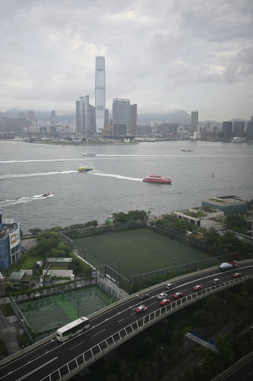 2019年6月、このレンズを存分に味わおうと香港へ向かいました。日頃は自他ともに認める「晴れ女」な私ですが、この時は珍しいことに滞在中のほとんどが雨。朝起きて窓の外を見やると、眼下を走る高速道路と海沿いのスポーツ施設越しに、たくさんの船が忙しなく行き交うビクトリアハーバー、その向こうには香港島の対岸、九龍側の高層ビル群と厚い雲で覆われた山……。これらの情報が過不足なく一枚の写真に収まり「ホテルの部屋からの風景」として成立しています。