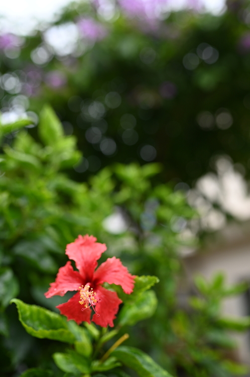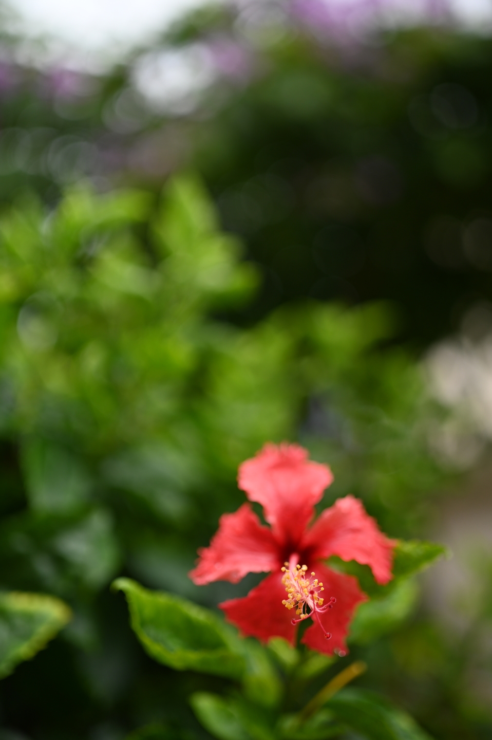 香港で南国らしい雨上がりのハイビスカスを、35mmの画角を活かして背景を広く取って玉ボケを入れつつ撮ってみました。開放F値が1.8ゆえに、広めの画角でも大きなボケを作りやすいのが特徴のひとつです。