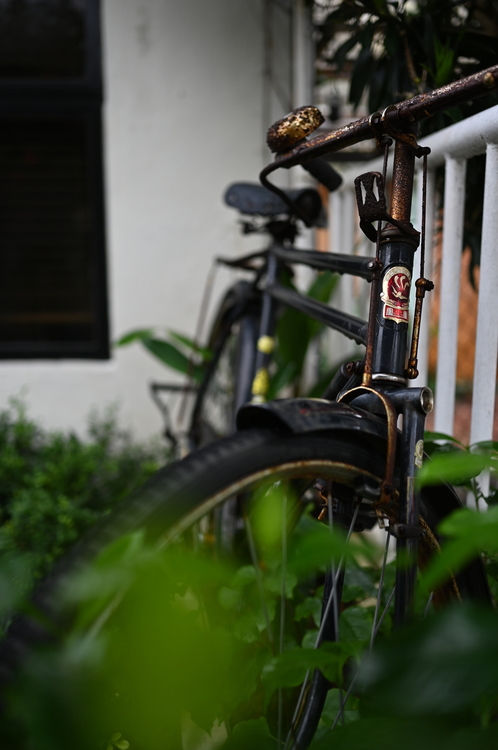 摩天楼が立ち並ぶイメージの強い香港ですが、街を少し離れると意外に長閑な光景と出会えます。とあるお家の軒先に停められていたレトロな自転車が素敵で、敷地の外から垣根のグリーン越しに撮影。手前のグリーンを前ボケに入れましたが、やわらかい緑が広がり、後ろの自転車の金属感や錆や金色と赤のエンブレムの質感を際立たせてくれました。