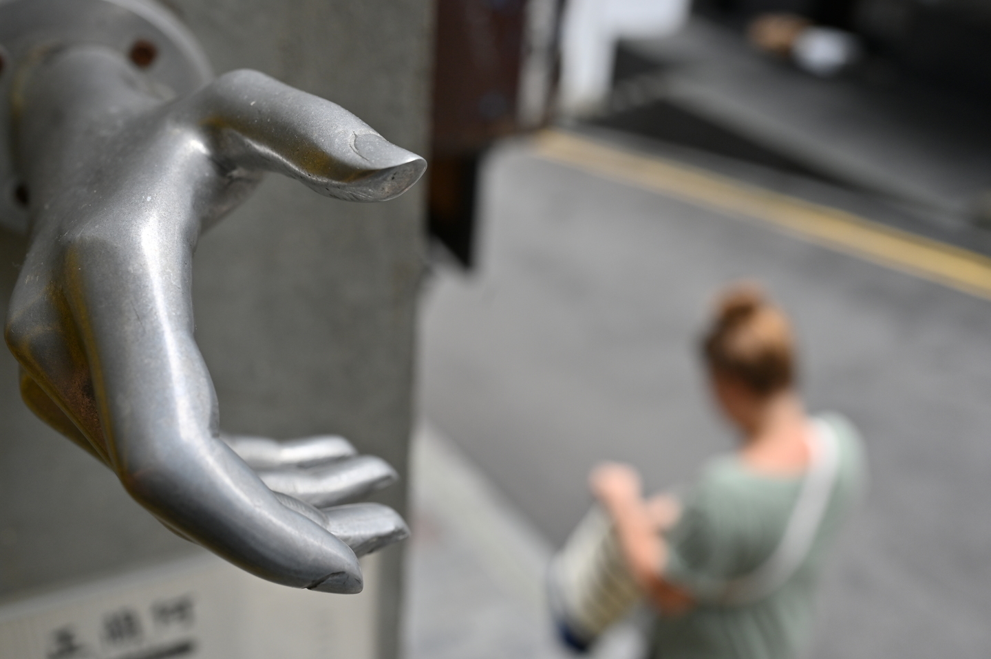 香港の街角、とあるカフェバーで入店する人を掴まえようとするかのように突き出した手のオブジェ。通りすがりの女性の服の色とも相まって全体としてやわらかいトーンに仕上がりつつも、金属のオブジェの硬さやつめたさといった質感がしっかり伝わってきます。