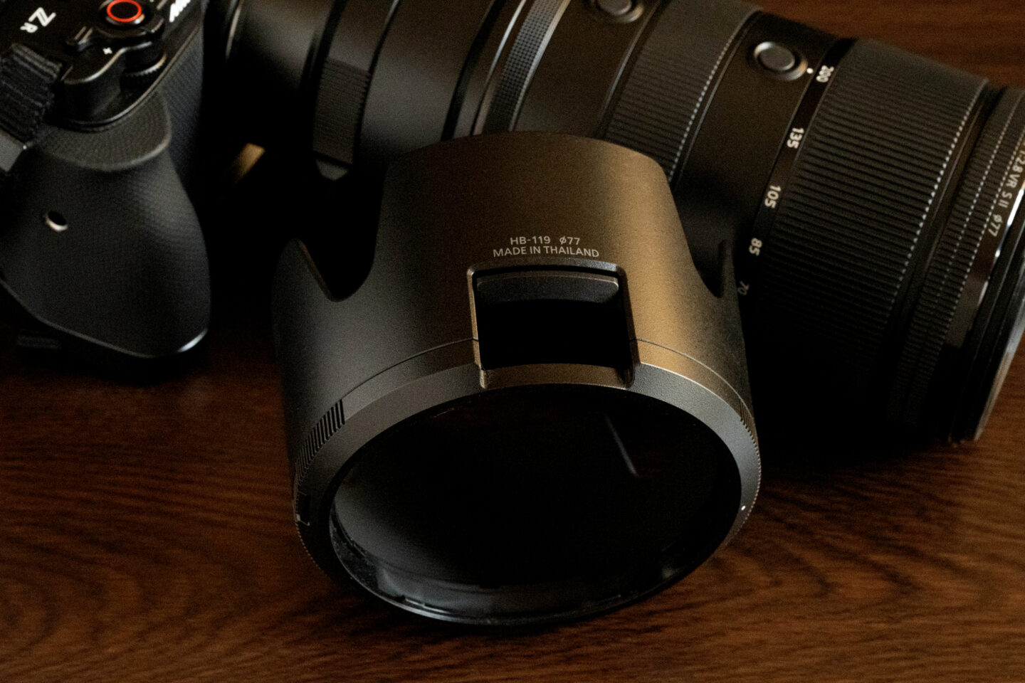 付属のレンズフード(HB-119)にはフィルター操作窓が装備され、円偏光フィルターなどの操作が容易になっています。フィルター径は24-70mm f/2.8 S IIと同じく77mmです。