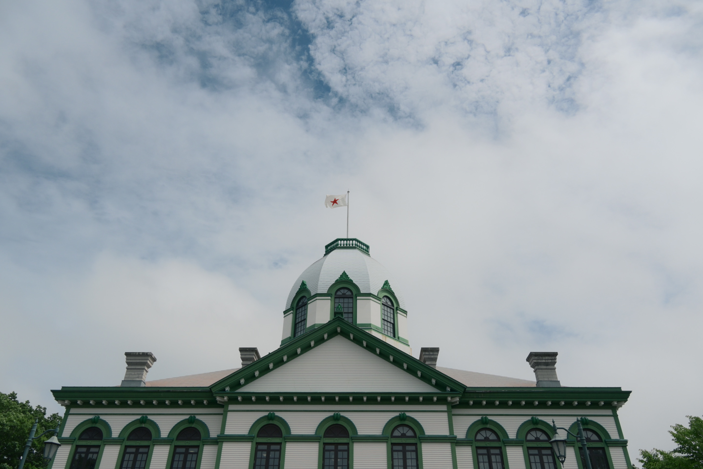 訪れた北海道開拓の村のシンボリックな建物のひとつ、旧開拓使札幌本庁舎の全景を入れるには一番広角がベストでした。この日はお天気が下り坂だったのですが、この時は少し晴れ間も見えていたため、貴重な青空を入れたかったことと、建物下部はどうしても入れたくないものが入ってしまうため、カメラを見上げる角度に振って空を大きく入れる構図としました。