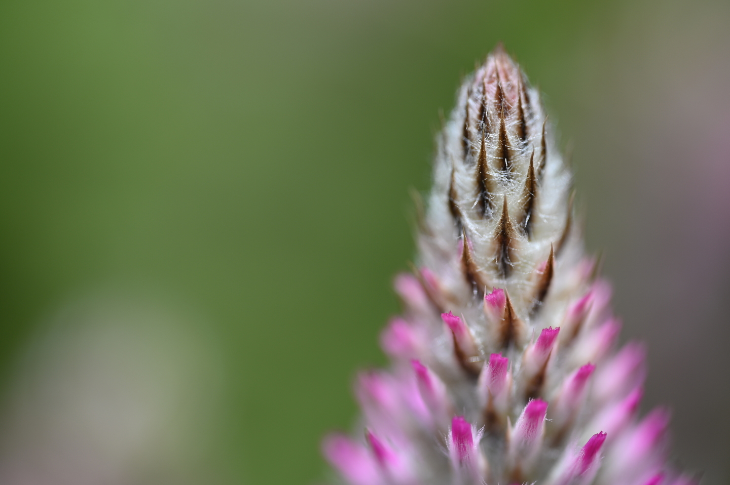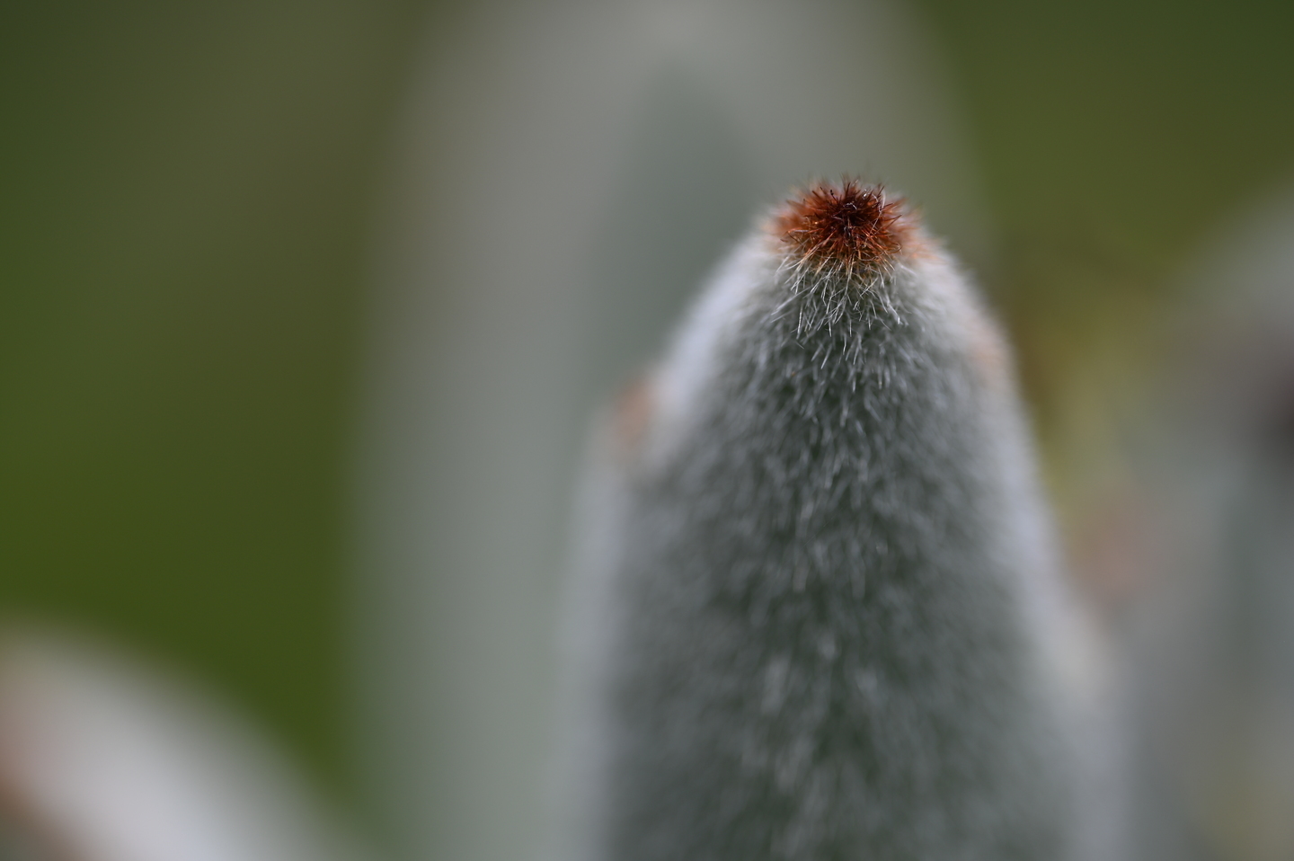 実際に手で触れてもさほど痛いわけではないものの、写真を見る限り触れるとめちゃくちゃ痛そう……なんだかそんな気がするほどの尖った先端、そしてその周りを覆う綿菓子のようなふわふわの質感。絞りは開放ですが、画像周辺部でも鮮明な描写が得られており、ピントの山からなだらかに、最後はふんわりとやわらかく、見事なボケのグラデーションが描かれています。ニコンのホームページに記載されている「美しいボケと高い解像性能のコントラスト」を実感する一枚となりました。