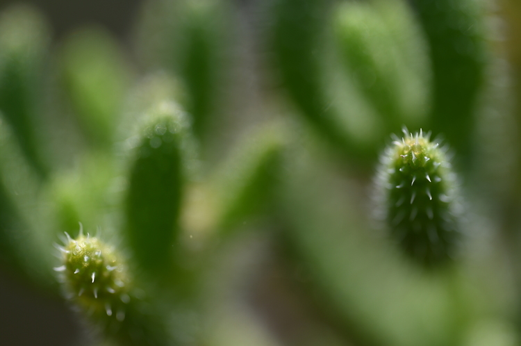 こちらのサボテンでは、ピントの合った棘の鋭さとは対照的に、アウトフォーカス部分の棘は見事なまぁるいボケとなり、その対比が面白い写真となりました。尚、ピントの合った棘の先端では乳白色の半透明感もしっかり表現され、その解像力の高さが窺えます。
