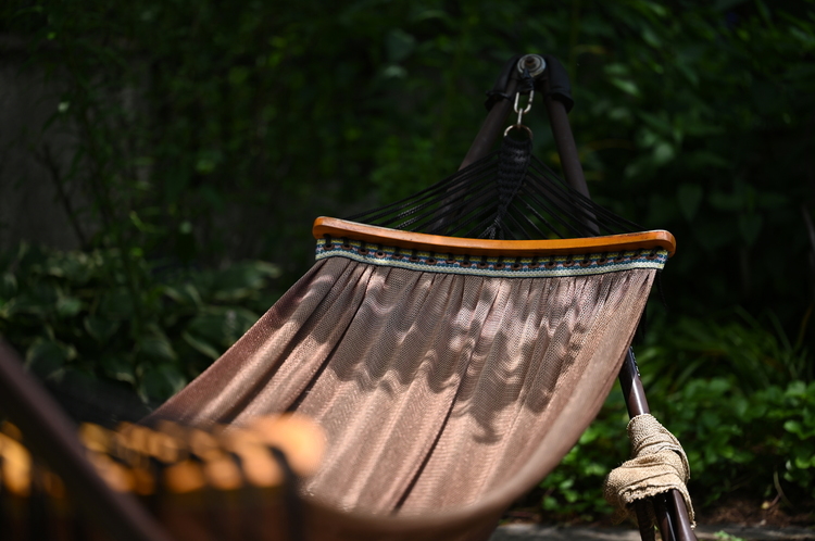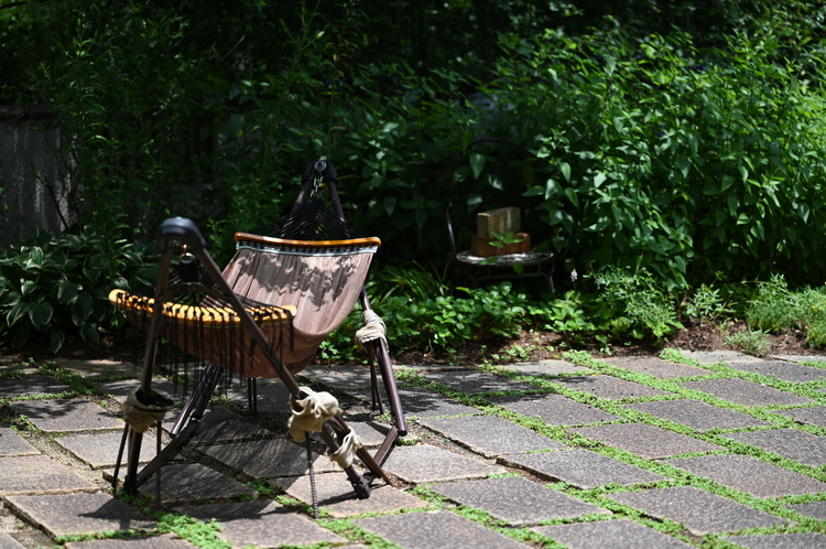 105mmの単焦点レンズと考えると、自分が立ち位置を変えることで被写体の大きさ・背景の写る範囲を変えることができます。少し引いて周りの情景まで入れて撮ったら、次は被写体に寄って大きく……すると、ハンモックのやわらかな素材の質感までもがしっかり伝わってきました。手前のボケと相まって「ここでのんびりチルできたら気持ちよさそうだなぁ」という想像力が膨らみます。