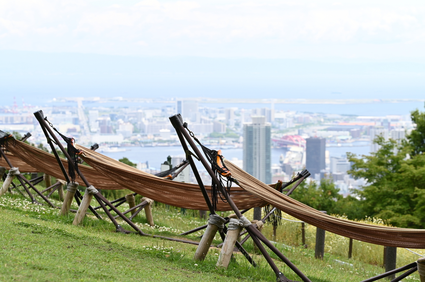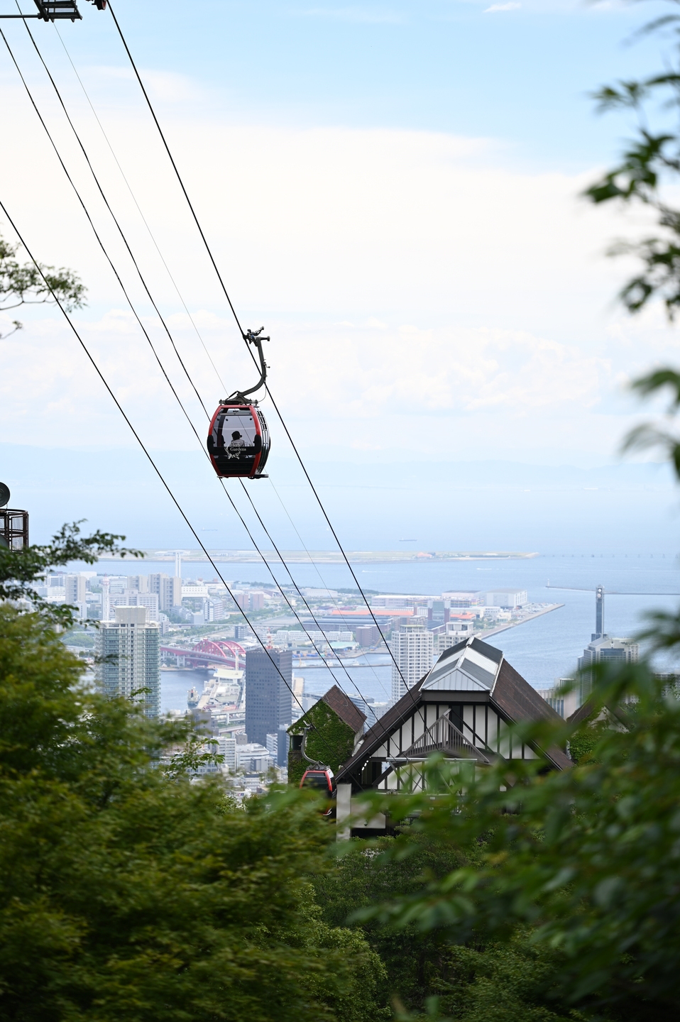 ロープウェイのゴンドラ越しに見える神戸の街を撮影するにあたり、どうしても画角に入る手前の木々を少しでもボカすために絞りを開放のF2.8にしています。ピントはロープウェイのゴンドラに合わせることで、絞り開放ながらも背景の街並みはボケることなくしっかりと解像感のある写真となりました。