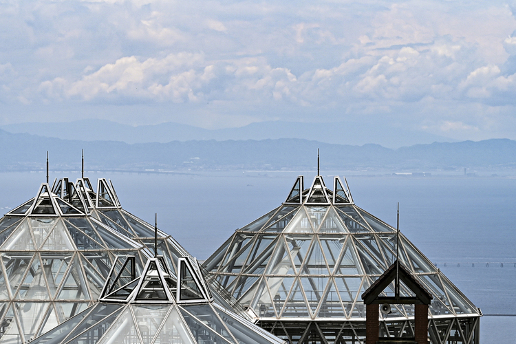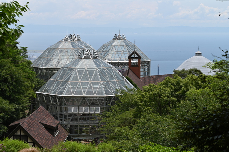 大阪湾を背景に、山の中腹に立つグラスハウスを撮影。家に帰ってパソコンの大きな画面で確認すると、大阪湾の対岸まで何やら写っていそうな気配が。そこで画像処理でかすみの除去などを行ってみると……直線距離で約20kmの対岸に位置する関西国際空港の連絡橋や空港ターミナルビルがしっかり見て取れます。この日は晴れてはいたものの視界は非常にクリアとは言えず、これはもうレンズの抜けの良さ、解像力の高さに他ならないと実感したのでした。