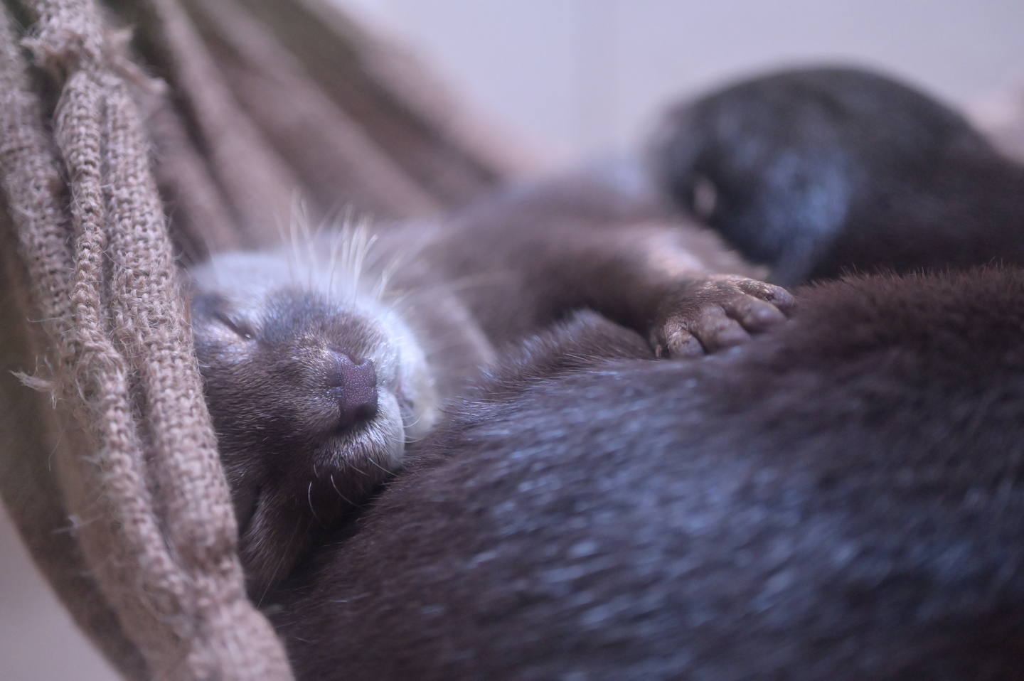 お互いの体を枕にするように寝ているコツメカワウソも、水槽のアクリル越しの撮影になります。描写の難しい暗い色の毛の質感と、動物らしい鼻のリアリティーを、高い解像力で表現してくれました。ピント面からボケへのグラデーションも、自然で好感の持てる描写です。マイクロレンズのキモは、被写体の質感をいかに丁寧に表現できるかとも言えます。