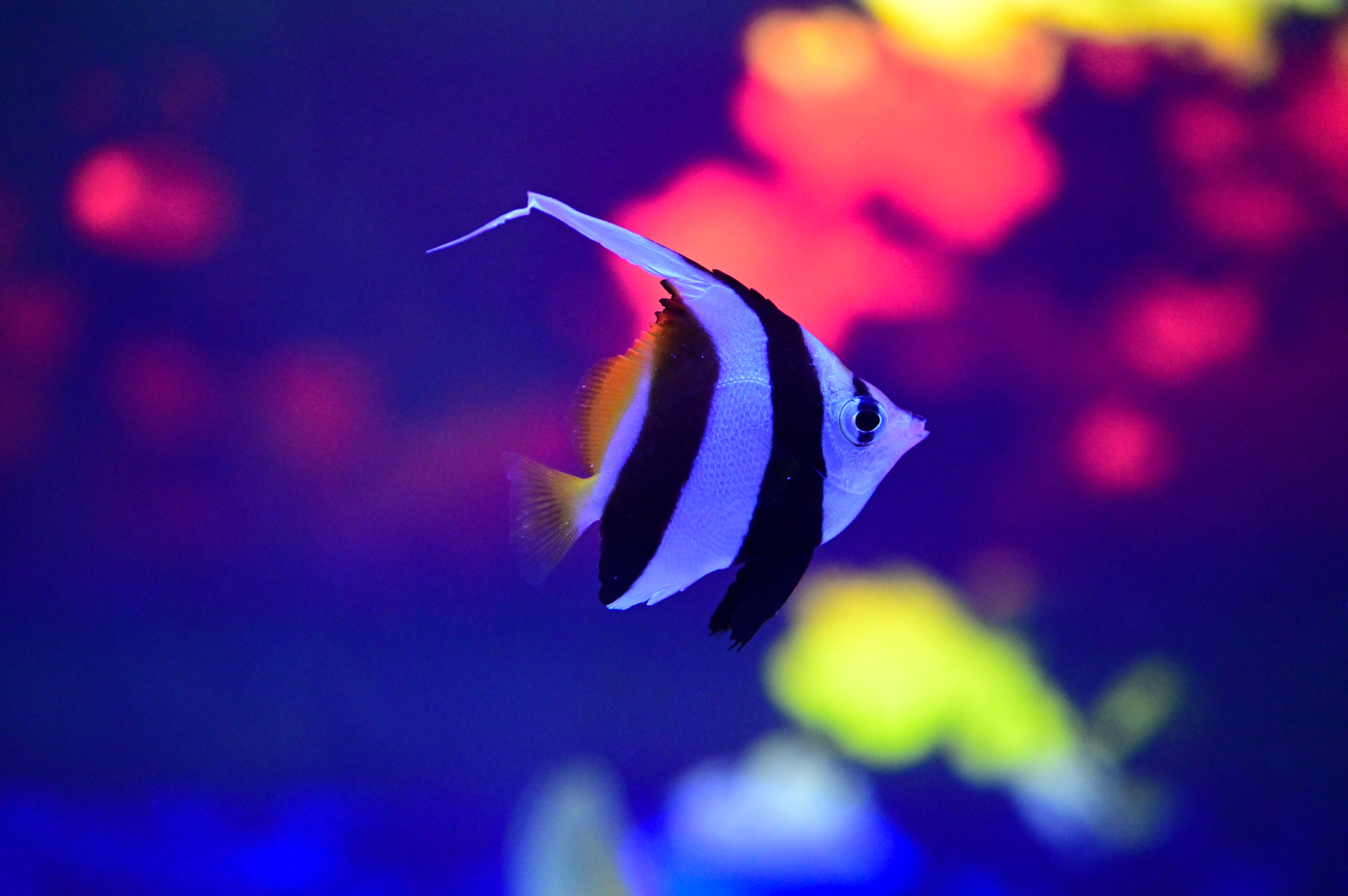 この水槽は中に造花がオブジェとして入っていて、そこをカクレクマノミが泳いでいるシチュエーションでした。水族館写真は、ともすれば魚の標本写真のオンパレードになってしまいがちですが、水槽の中のオブジェやサンゴ、水草などをボケに使用すれば、奥行き感のある写真を撮ることができます。この造花は背景のボケとして役立ってくれました。