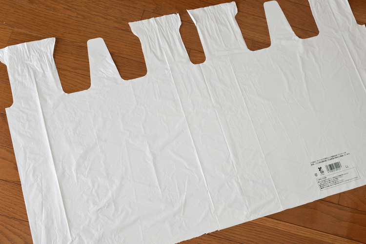今では有料になった、スーパーのレジ袋もディフューザーとして利用することができます。そのまま使うのではなく、このようにハサミで切り開いて使います。大きめのレジ袋だと約5円程度なので、買い物ついでに入手して下さい。あとは、トレーシングペーパーと同じようにテープで窓に貼り付けます。