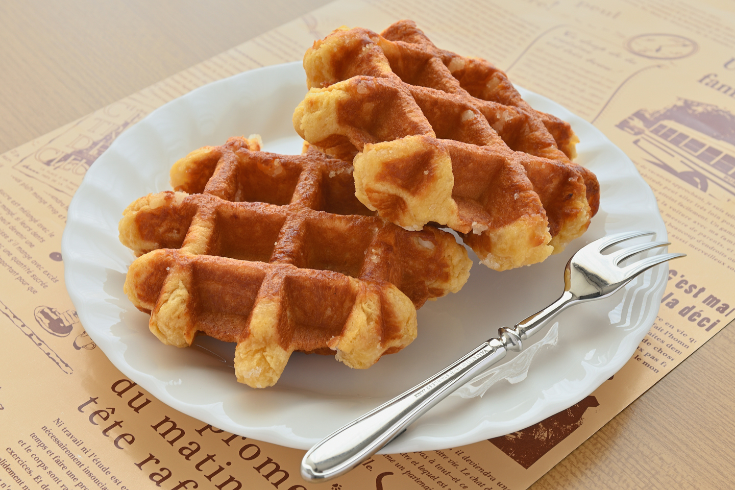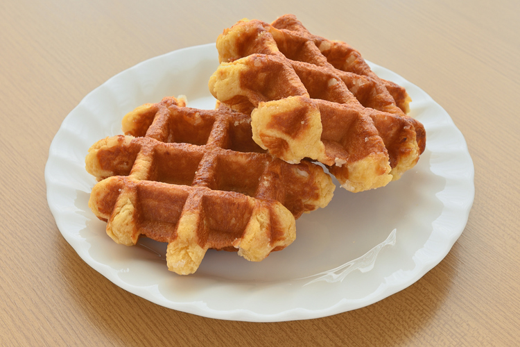 この画像は、お皿にのせたワッフルをそのままテーブルに置いて撮影したものです。単純にワッフルを撮りましたという画像でしかありません。雰囲気作りがされていないため、ありきたりでつまらない画像です。