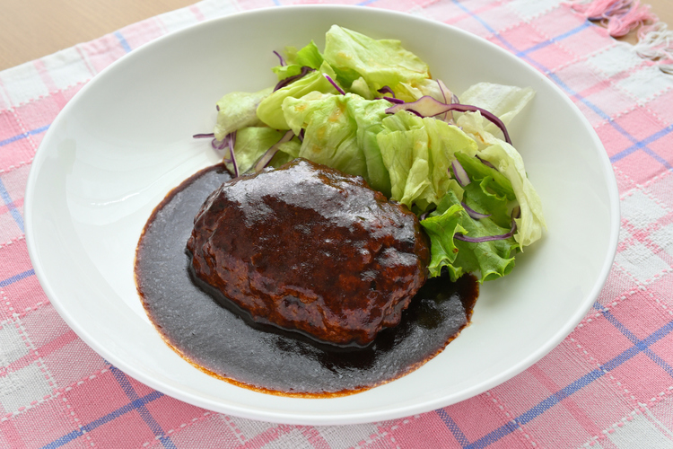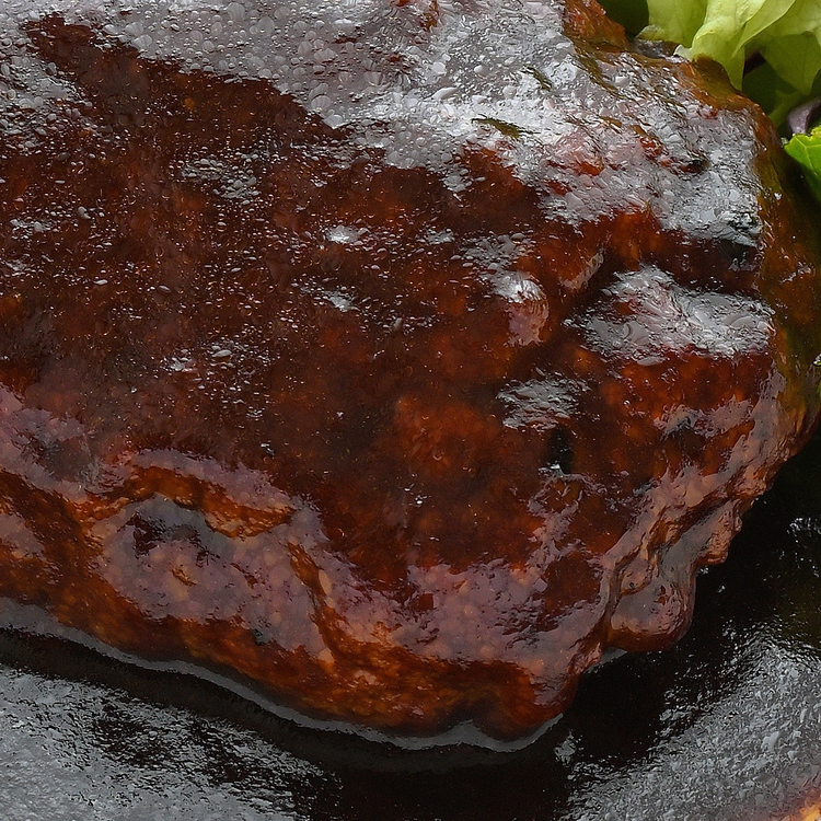 ハンバーグにかかった濃厚なデミグラスソースの照りがシズル感を強調しています。さらに、肉汁の油がソースの中に溶け込んでいる状態まではっきり見ることができます。このように、スーパーで売っている惣菜を使っても料理本などに出ているような画像を、自宅で撮ることができます。