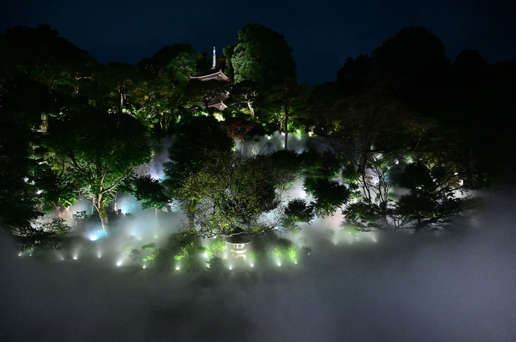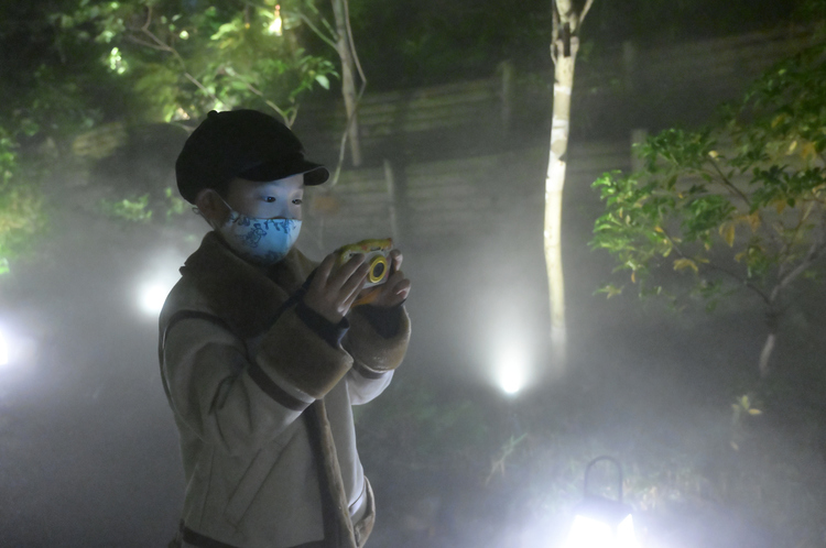 作例のカットは、椿山荘で行われている東京雲海の夜バージョンです。撮影時に開催されていた、人工的に雲海を作り出すイベントで、宿泊している部屋から見下ろすと本物の雲海のように見えました。せっかくなので、雲海の中に入るというなかなかできない体験をしたくて庭園に出て撮ったのが、このカットです。