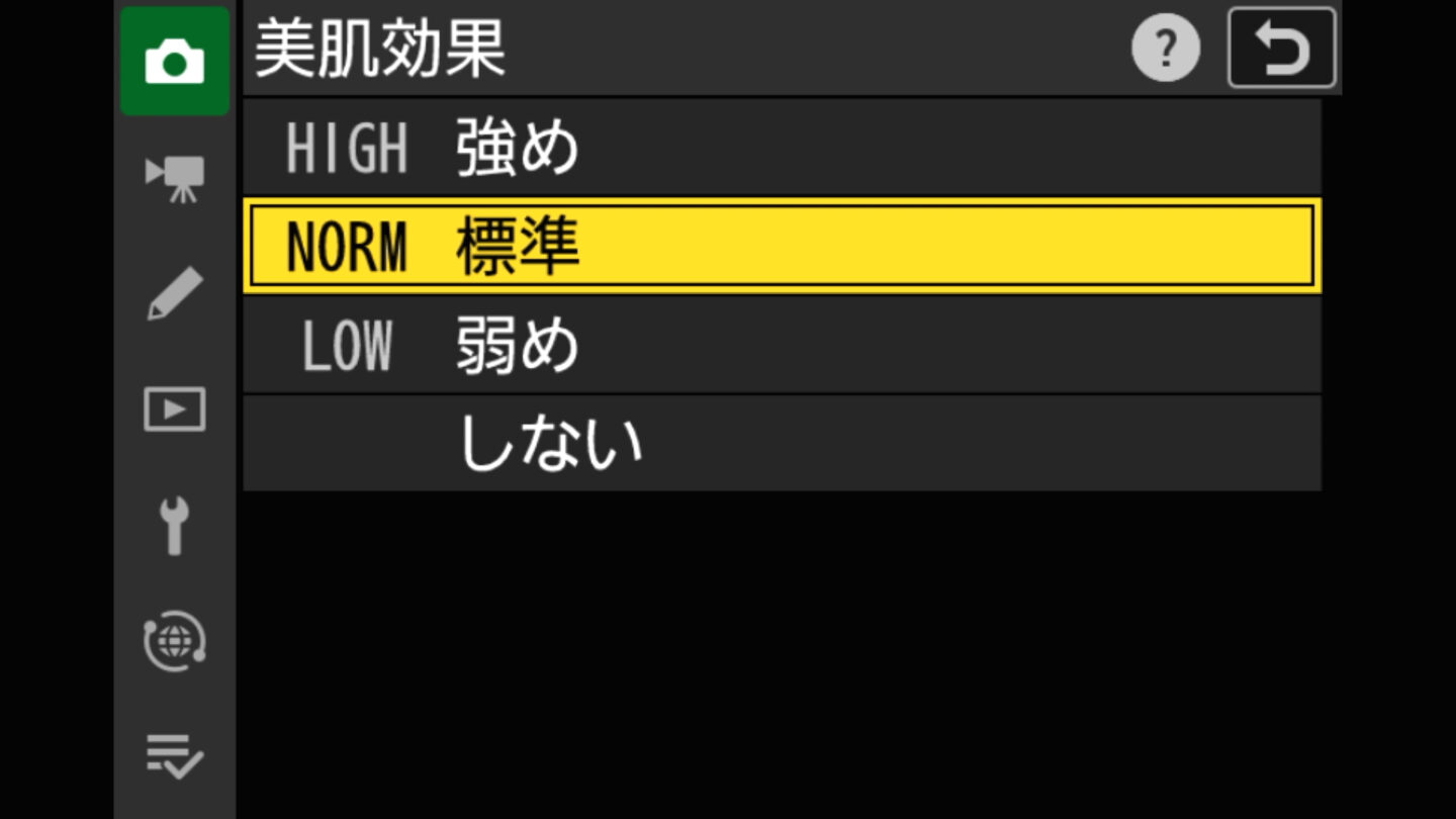 また、「人物印象調整」機能に加え、新たに「美肌効果」機能を搭載し、特にポートレート撮影において、より思い通りの表現が可能になります。「美肌効果」はHIGH強め、NORM標準、LOW弱めから選択が可能です。