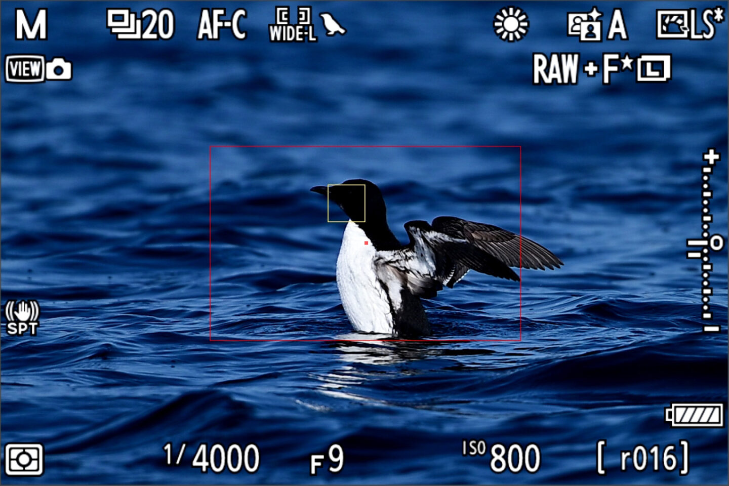 波間に漂うハシブトウミガラス。顔が黒く目がはっきりしない鳥でも、鳥の目を検出してくれているのがわかる。