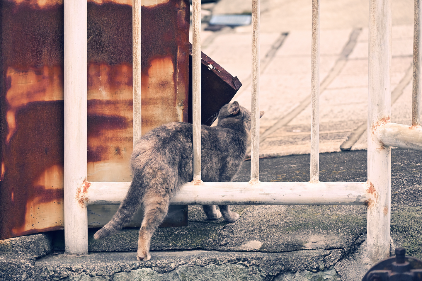 筆者は旅先に行くと、その土地のネコをよく撮っています。なんだか、その土地の空気を身にまとっているような気がして、そのムードを撮らせてもらっている感じでしょうか。こちらは器用に柵を抜けていく様子がかわいらしくて、その後姿を撮影しました。