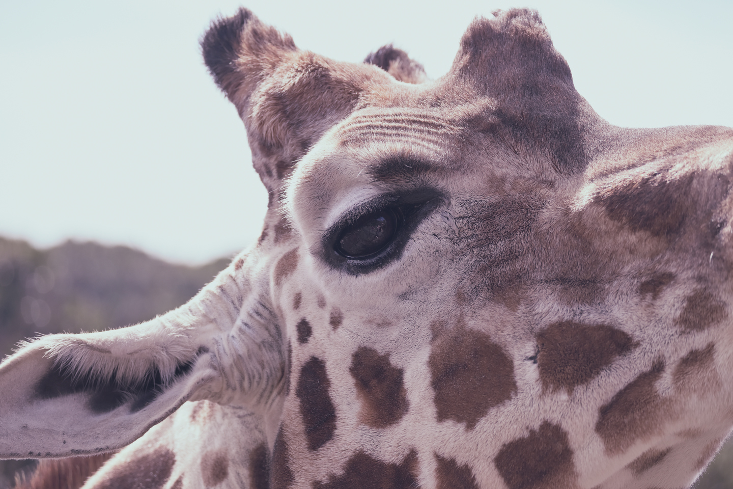 さて、これはなんでしょう? 正解は、キリンの顔です。柵越しですが、動物たちにエサをあげられるところで撮影しました。ざらざらした長い舌で、結構な勢いでエサを手から取っていくので、ちょっと迫力のあるエサやりです。その舌が入る構図でも撮ったのですが、つぶらな瞳が大きく写っているこちらのカットのほうが、筆者の好みでした。