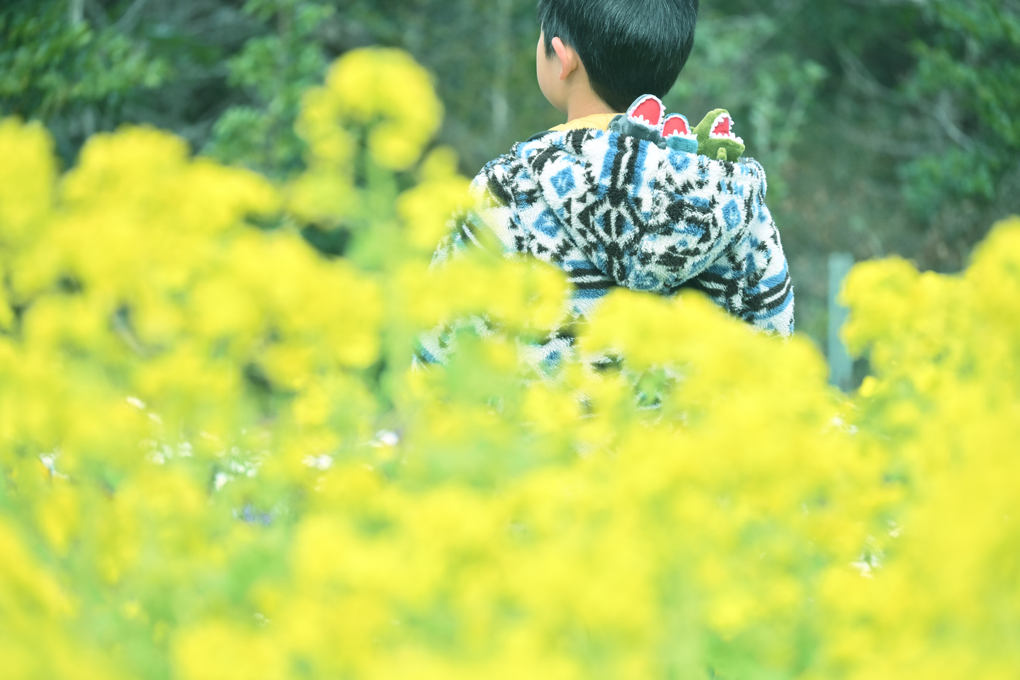 菜の花畑の向こうにいる子供を主役にして、菜の花をボケさせて黄色いカーテンのようにして撮影しました。子供のフードに入っているのは、この少し前にクレーンゲームで獲得した恐竜の子供のぬいぐるみです。まるで巣で口を開けてエサを待っている小鳥(子恐竜?)のように見えたのが面白くて、あえて後ろを向いてもらいました。