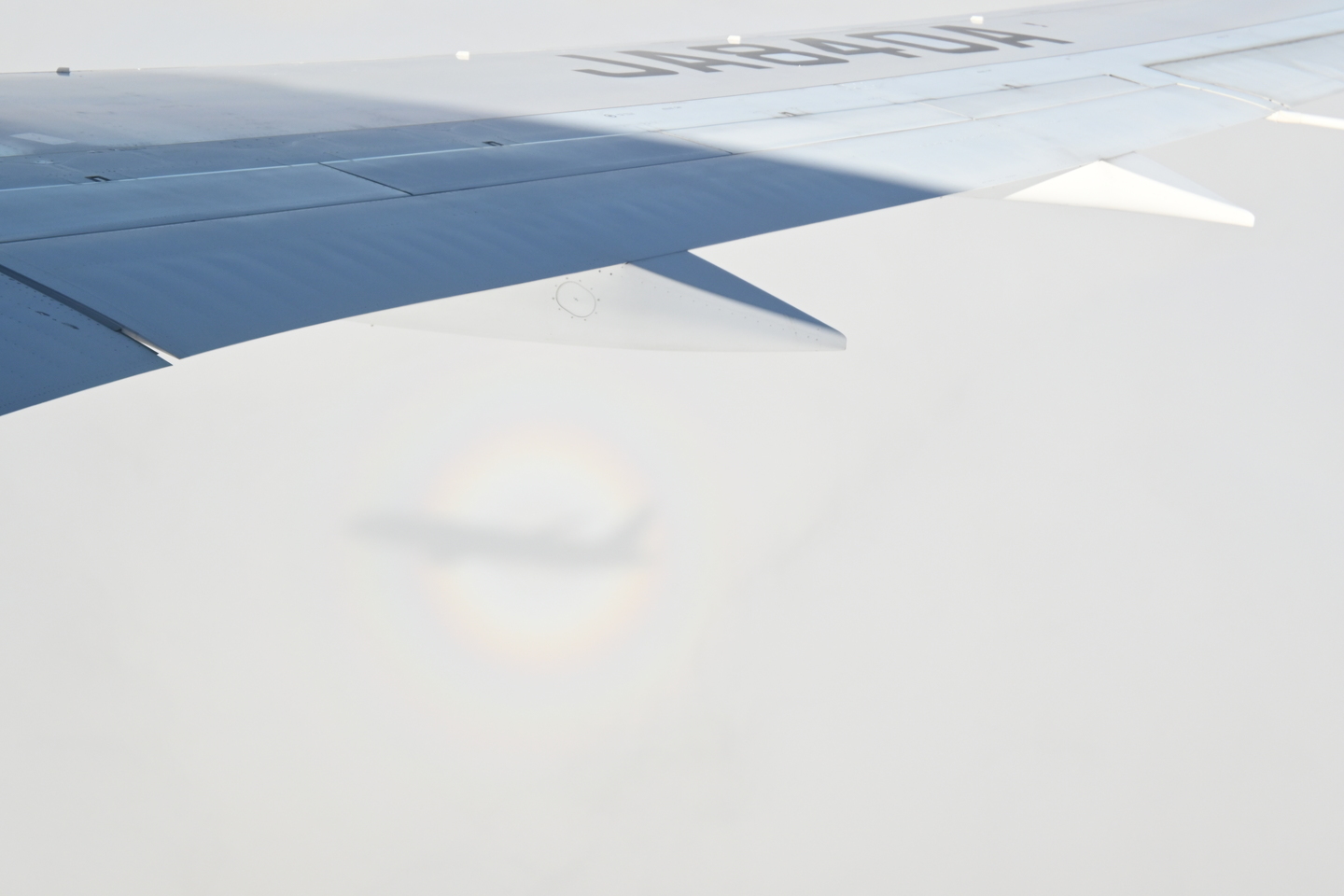 窓の外にブロッケン現象が!慌ててカメラを取り出してパチリ。機内でも手元に置いておけるサイズというのは非常に重要です。