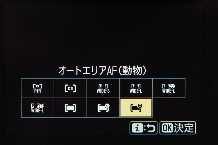 一方、本機ではZ 6IIなどと同様にデフォルトでAFエリアモードの選択肢として「ワイドエリアAF(L-人物)」「ワイドエリアAF(L-動物)」「オートエリアAF(人物)」「オートエリアAF(動物)」という項目があります。iボタンでよく使うショートカット的なメニューを呼び出し、AFエリアモードからすぐに設定を変更することができて非常に便利となりました。