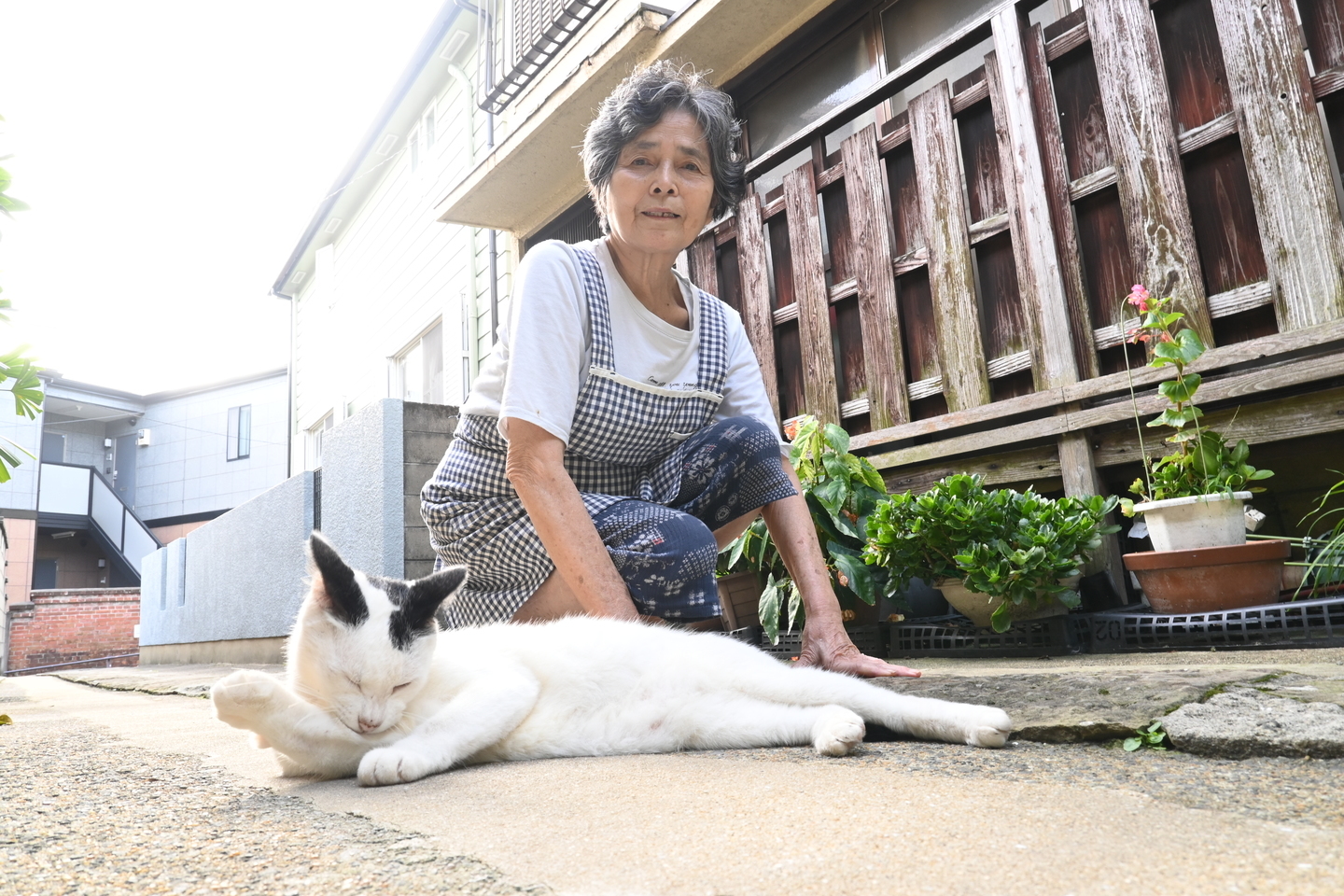とあるおうちの前の路地で寛ぐ猫ちゃんを発見。ちょうど飼い主さんがおられたので一緒に撮らせていただきました。この時は動物よりも人物優先、iボタンから設定をオートエリアAF(人物)にパパッと変更して撮影。操作性の良さは重要です。