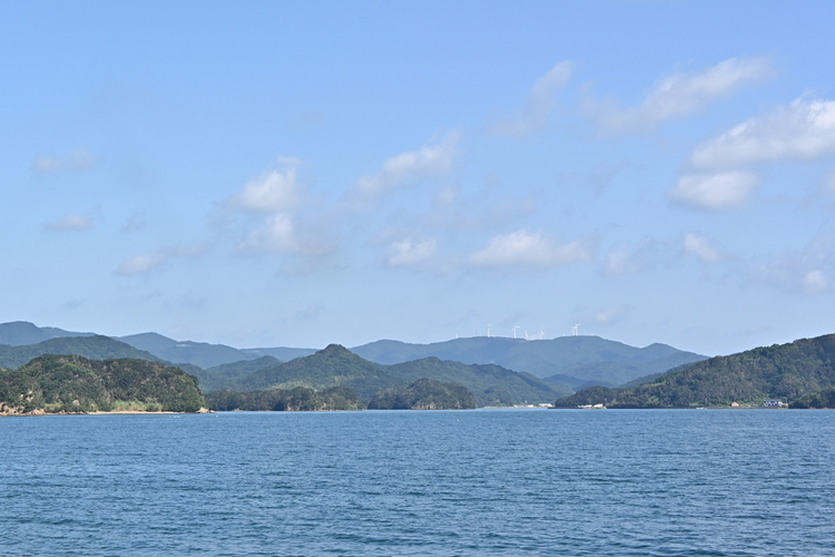 黒島へ向かうフェリーより九十九島を望む。クイックシャープを+2.0に上げることで、遠くの山上にある風力発電機もよりはっきりと捉えることができました。