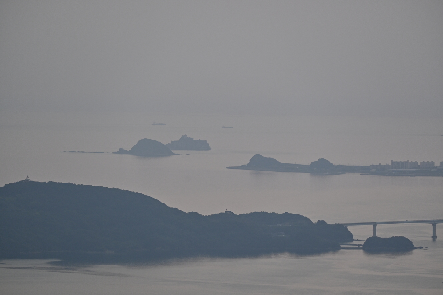 稲佐山山頂展望台より撮影。望遠レンズを通して初めて目にする端島(通称 軍艦島)の、確かに軍艦のような姿をした島影にひとりテンションアップ。次回は実際に訪れてみたいものです。