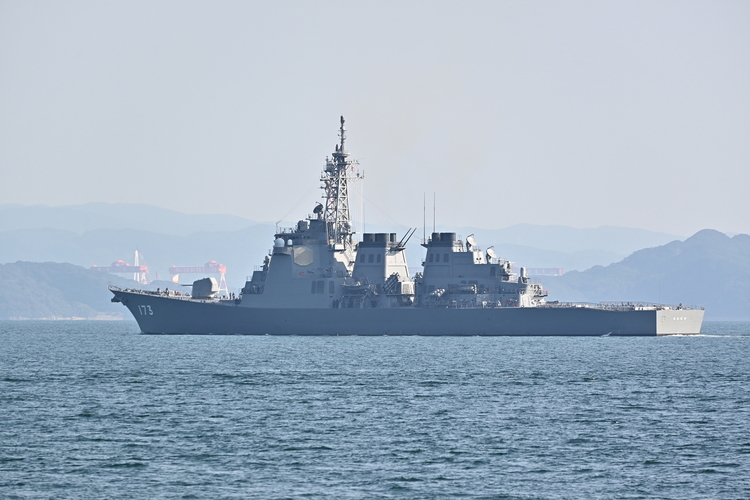 佐世保に向かって航行中の自衛隊の護衛艦を海上で発見、目一杯望遠の250mm(35mm判換算375mm)でクイックシャープを+2に設定。拡大して見ると甲板にはマスクをした自衛官の姿や「こんごう」という護衛艦の船名、またその奥に位置する島の造船所名と会社の標語までもがしっかり見て取れます。のちに地図上で確認すると、護衛艦までの距離はおそらく約10km程のようでした。