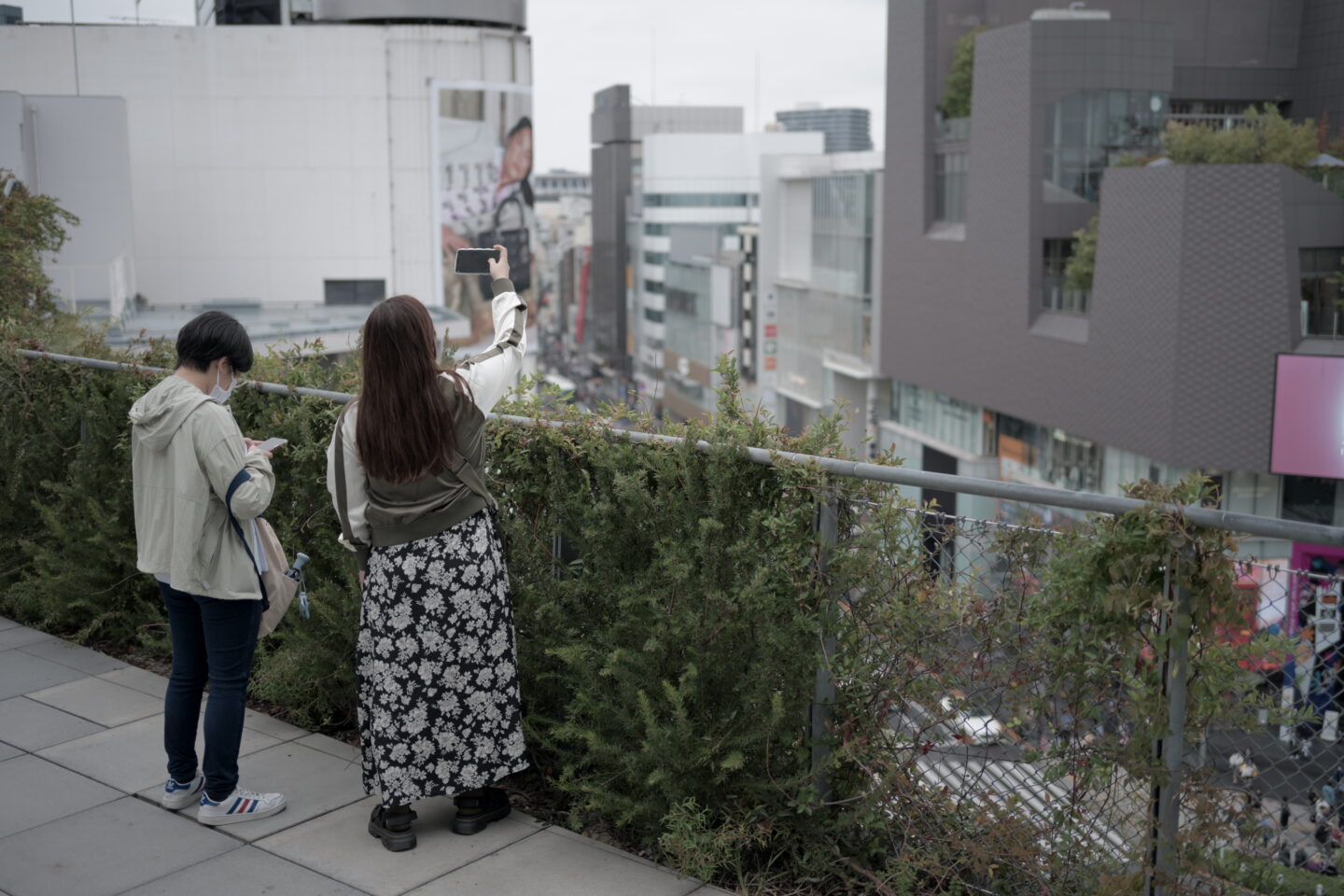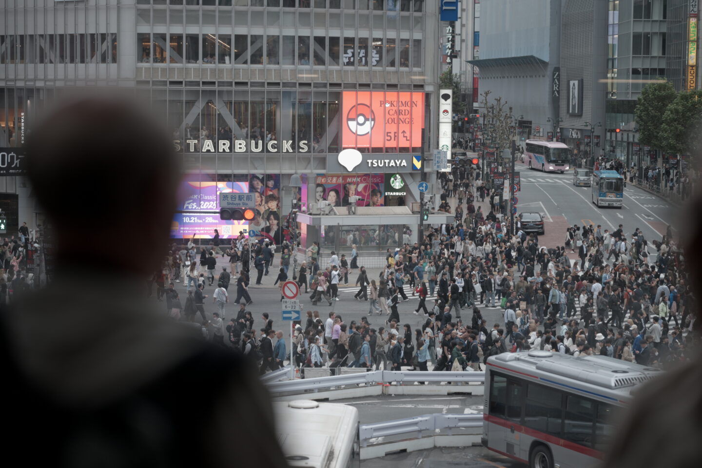 「NIKKOR Z 85mm f/1.8 S」で渋谷駅コンコースのガラス越しにハチ公前交差点を狙いました。「CineBias_RED」はふだん通り過ぎる交差点をドラマティックに表現してくれました。