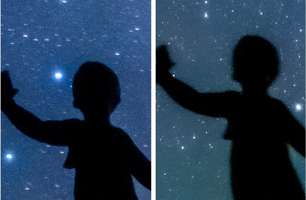 左のコンパクト赤道儀なし17mm(35mm換算34mm相当)の 17秒だと少し星が流れています。より明るいレンズだともう少し秒数を短くできるので点像として表現できますね。