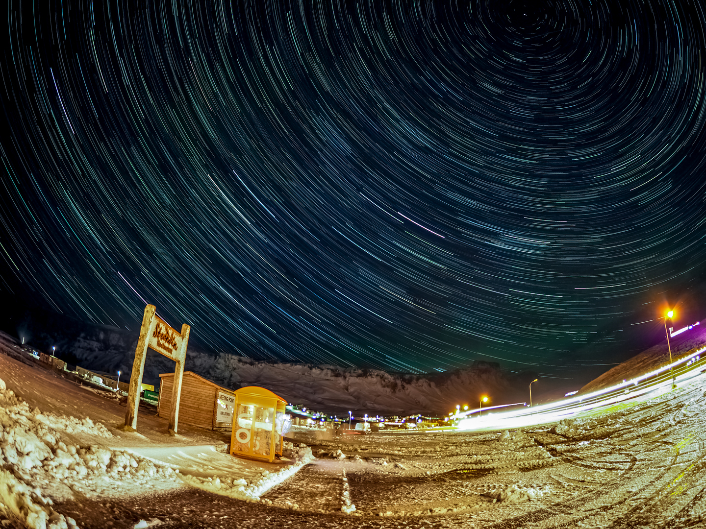 最後に空気の奇麗なアイスランドでの星景撮影。雪だらけの街の中、街灯の反射で肉眼では暗い雪面が明るく表現できています。低いISO感度でも奇麗な星の光跡が表現出来ました。ちなみに奥の緑色の部分はオーロラです!!