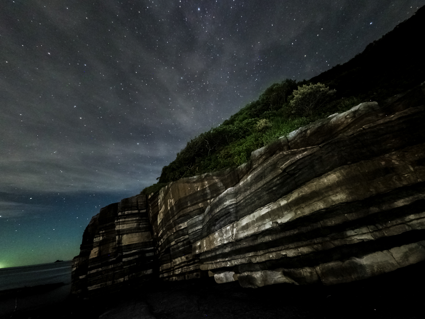 1枚目は重厚な断層と星の幻想的な風景、2枚目は奥へと吸い込まれていきそうな面白い表現と全く違う表現方法となりましたね。(ちなみに2枚目の左下の光のラインは漁火漁船が通過したラインです)ここでは断層の模様を出したかったので露光中にストロボ(オープンフラッシュ)を焚いています。