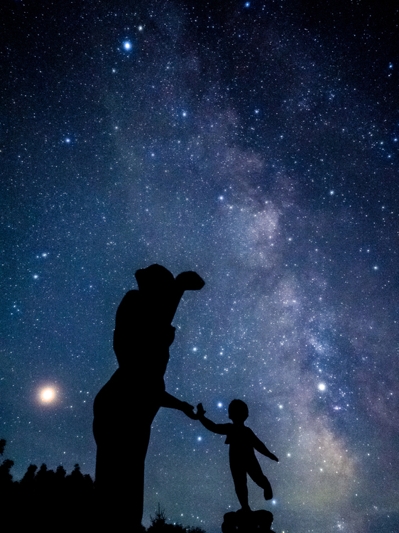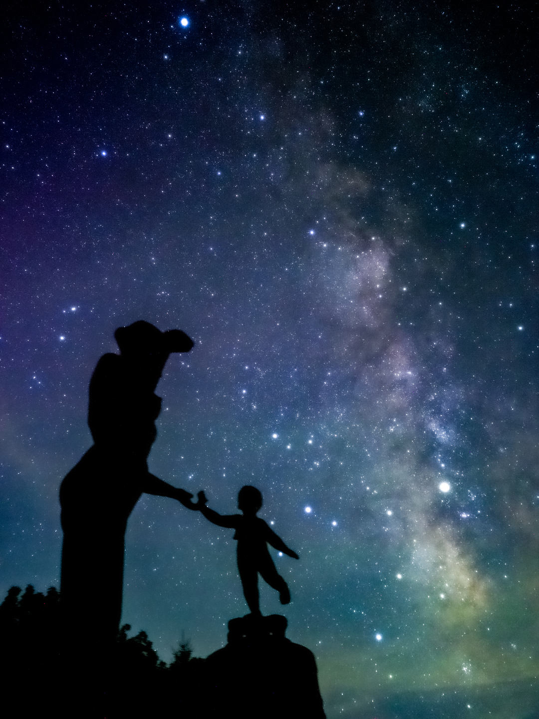 この作例は上記の機材+ コンパクト赤道儀「ポラリエ」(星を追いかける機材)を使うことで星は動かず、長時間露光で天の川がより幻想的になりました。逆に赤道儀を使用したため、下部の銅像が少し動きましたが逆に銅像の輪郭が滲んで童話のような世界を表現できました。