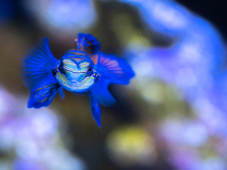この魚は熱帯の海域でよくみられる、レインボーカラーで絵になるマンダリンフィッシュ(日本名:ニシキテグリ)です。小さな魚ですがアップで撮影すると背景のボケも大きくなり、絵になります。小さな魚こそ、実はよく観察すると案外絵になる魚が多いです。見逃さないように。