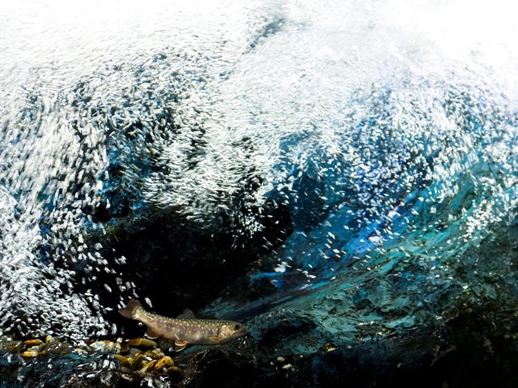 この水槽は淡水魚の水槽であたかも実際の渓谷に居るような感じに見学できるように岩の色や質感、空気の泡などをうまく取り入れているので撮影するとご覧の通りです。