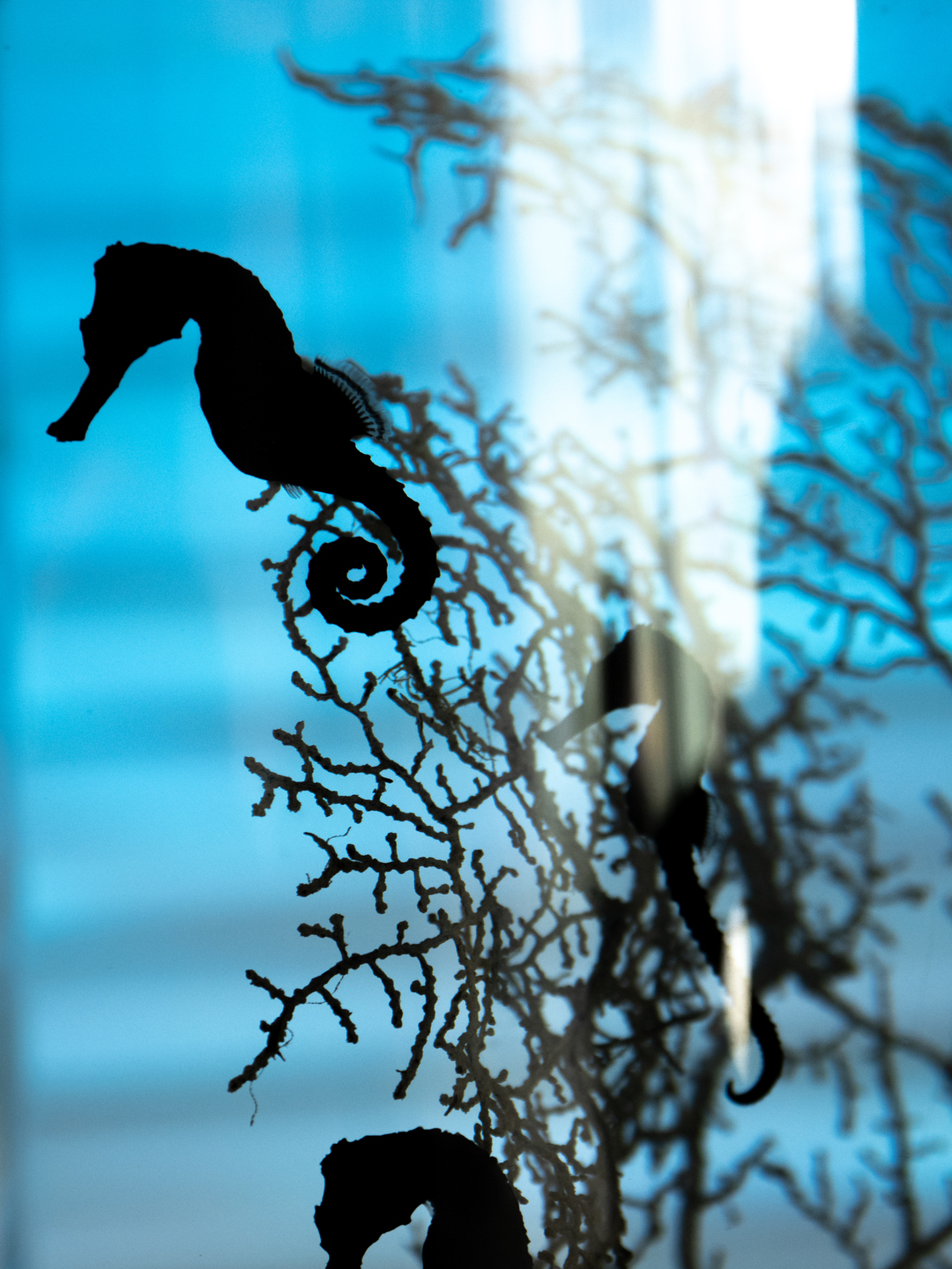 また、水族館でしか表現できないユニークな展示物を取り入れた撮影も効果的です。水槽の周りが奇麗なピュアホワイトの壁でしたので額縁効果を考えてフレーミングしました。