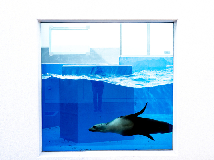 動画を見ていただくとわかりますが、この水槽のアシカは同じ動作を繰り返しているのがわかります。ですので慌てず、じっくりとフレーミングをしてチャンスを待ちましょう。この撮影では額縁構図にするためにカメラ位置が真正面でしたのでPLフィルターなどで反射を防ぐことが出来ないですが、自分の足の影をわざと取り入れて作画してみました。