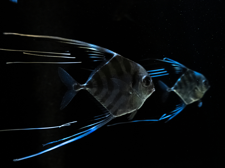 イトヒキアジはなかなか海に潜っても見られない絵になる魚なのですが、背景が黒でしかもペアで撮影できた時は大変嬉しかったです。この後、数か月後にもう一度この水族館に行ったのですが、もうイトヒキアジはいませんでした。