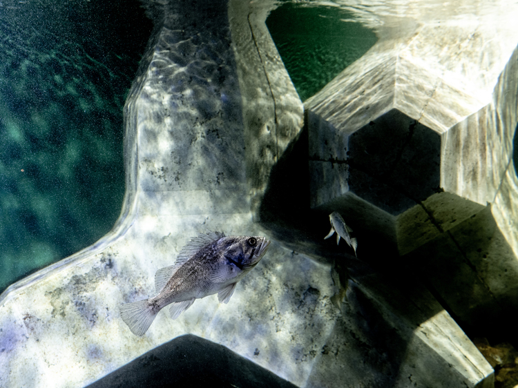 テトラポッドにメバルが居る光景は釣り人やダイバーなら想像がつきますが実際、海に潜ってもこのような場所はやっぱり濁っていてなかなか撮影は出来ないんです。この作品はテトラの白い部分にメバルが来るチャンスを狙いました。