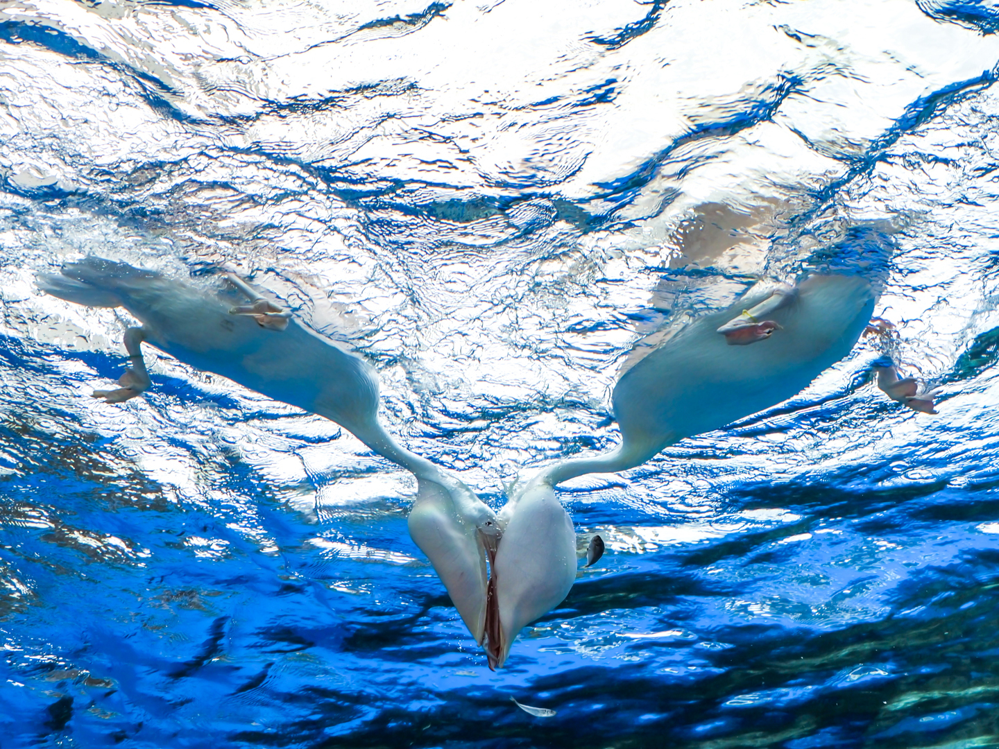 餌やりのタイミング時にモモイロペリカンが1匹の魚を巡って争っています。一瞬のチャンスでしたがモノに出来て良かったです。それにしても水が奇麗なのと大水槽の下から見られるこの展示方法には脱帽ですね。